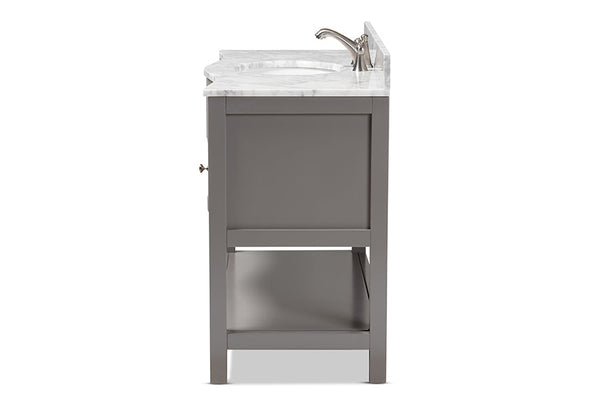 Give you bathroom a modern upgrade with the Castie 48-inch bathroom vanity. Crafted from high quality materials to ensure years of use, the vanity features a solid wood base and a stunning white Carra marble countertop. Five large drawers provide space to store toiletries, grooming tools, and more. An open lower shelf provides extensive storage space for towels and linens.