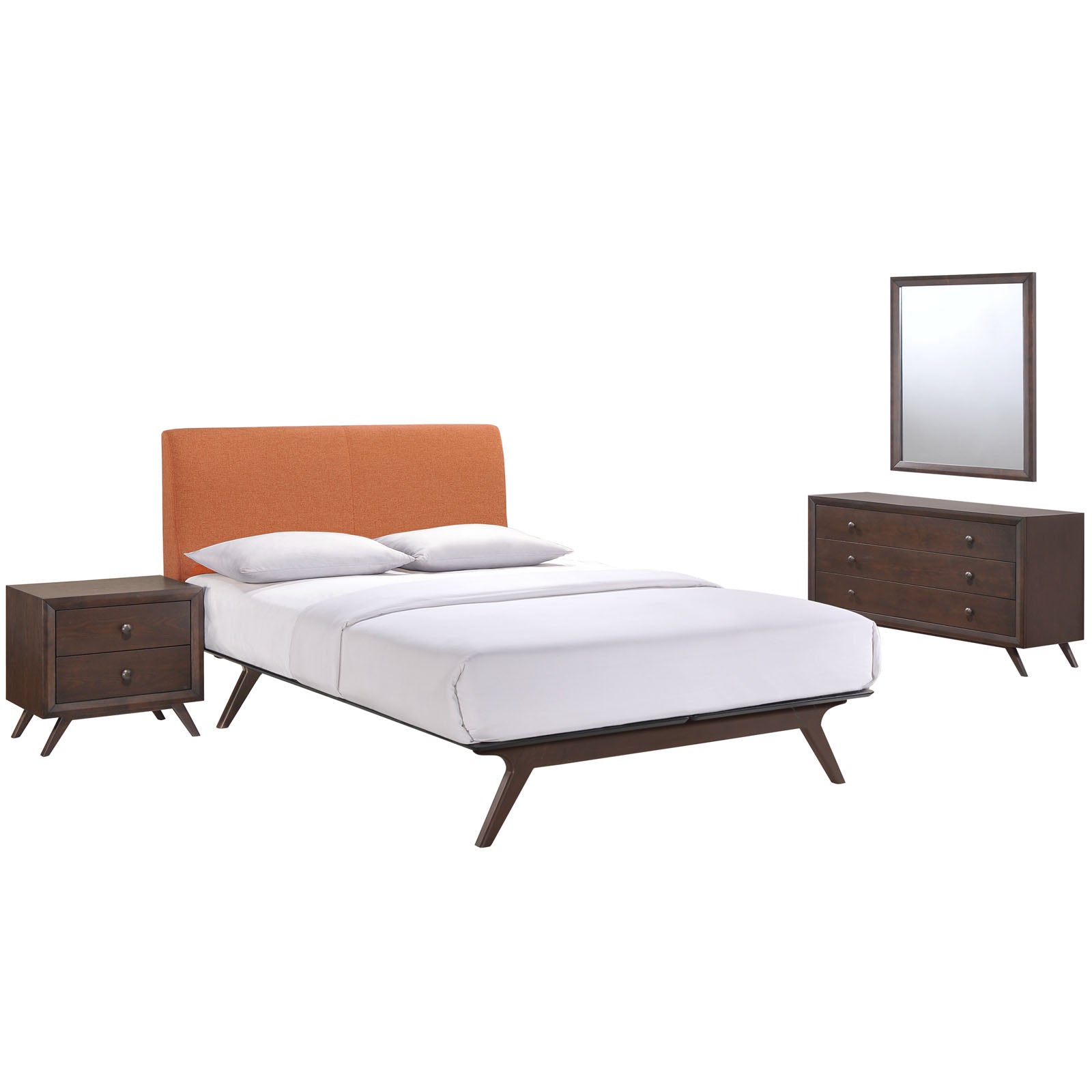Transform your ordinary bedroom arrangements into a more compelling décor with the Tracy bedroom set. The Tracy bed, with its open design and platform leg support, proves that elegance doesn’t need to come at the expense of simplicity. Finely upholstered with a foam padded fabric headboard, Tracy is an easy to maintain toffee brown stained piece that admirably delivers both comfort and style. Tracy requires assembly and should be spot cleaned only. Headboard included. Queen size mattress not included. The Tracy queen size platform bed does not need a box spring. Set Includes: One - Tracy Night Stand One - Tracy Queen Bed Frame One - Tracy Wood Dresser One - Tracy Wood Mirror