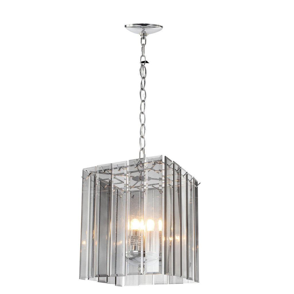 A dramatic, stunning way to light up a space for a soft, charming glow. This beautifully unique glass chandelier will gave sparkle to brilliant evenings at any room. It is accented with glass panels that capture and brilliantly reflect the light of the bulb. The timeless elegance of this chandelier is sure to lend a special atmosphere anywhere its placed!. Made of glass and metal.