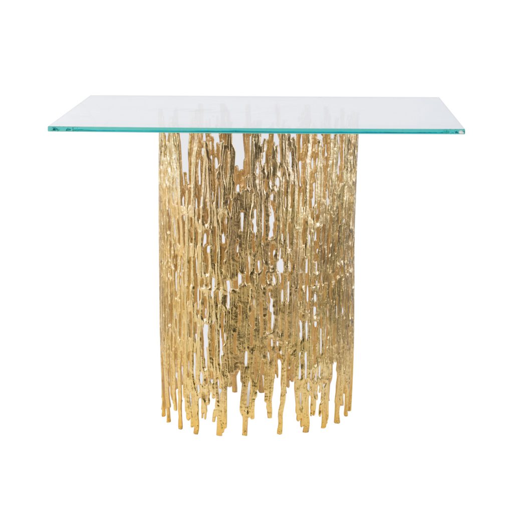 Inspired by natural elements, this molten center table perfectly represents the essence of artisan design & craftsmanship. The charm of brass electroplated finish on molten aluminum gives this table a unique beauty. The slight irregularities suggest a connection to nature and handcrafting rather than the sharp precision of machine production. Also available in other sizes. A&B Home exclusive.