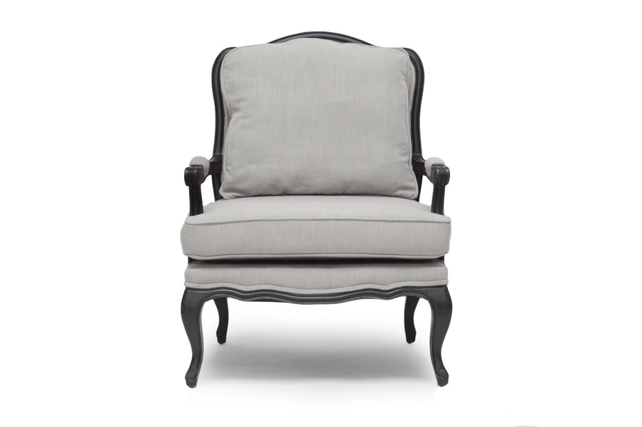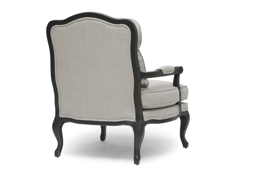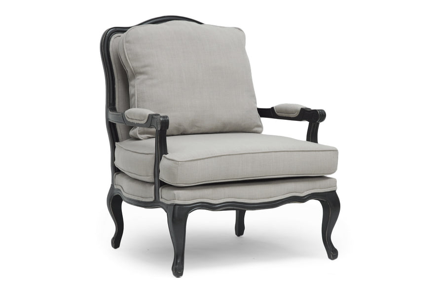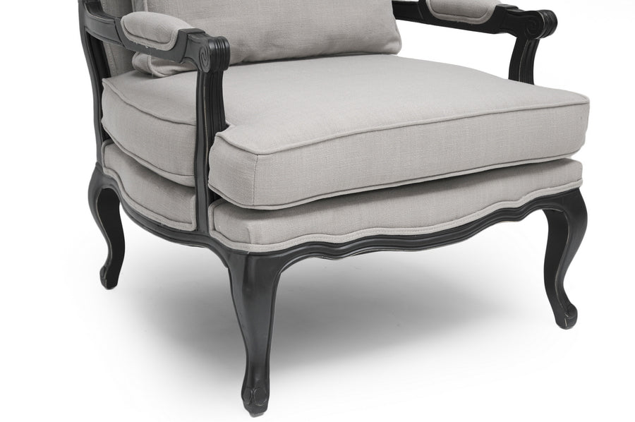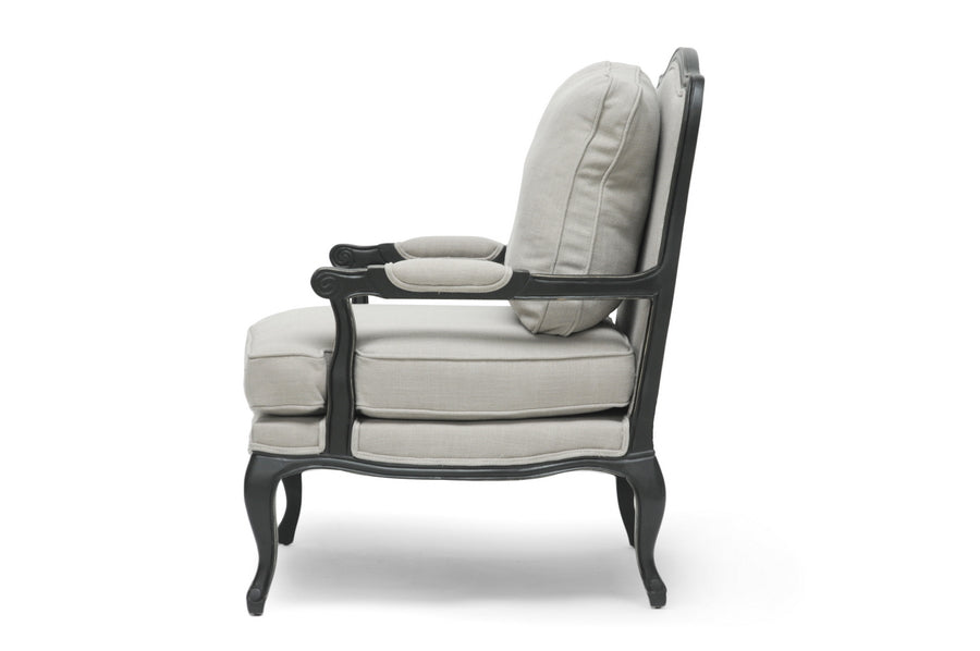 Relax in the lap of luxury. The Antoinette French Living Room Chair has all the fixings of exquisite old-world French detail: scalloped and scrolled wood trim, padded armrests, and distressed wood, complete with the finish rubbed off on the edges. A black rubberwood frame flanks comfortable foam cushions encased in neutral gray-beige linen upholstery. A removable backrest cushion is also included. We recommend exclusively spot cleaning. The Antoinette Designer Arm Chair is made in China and requires assembly.