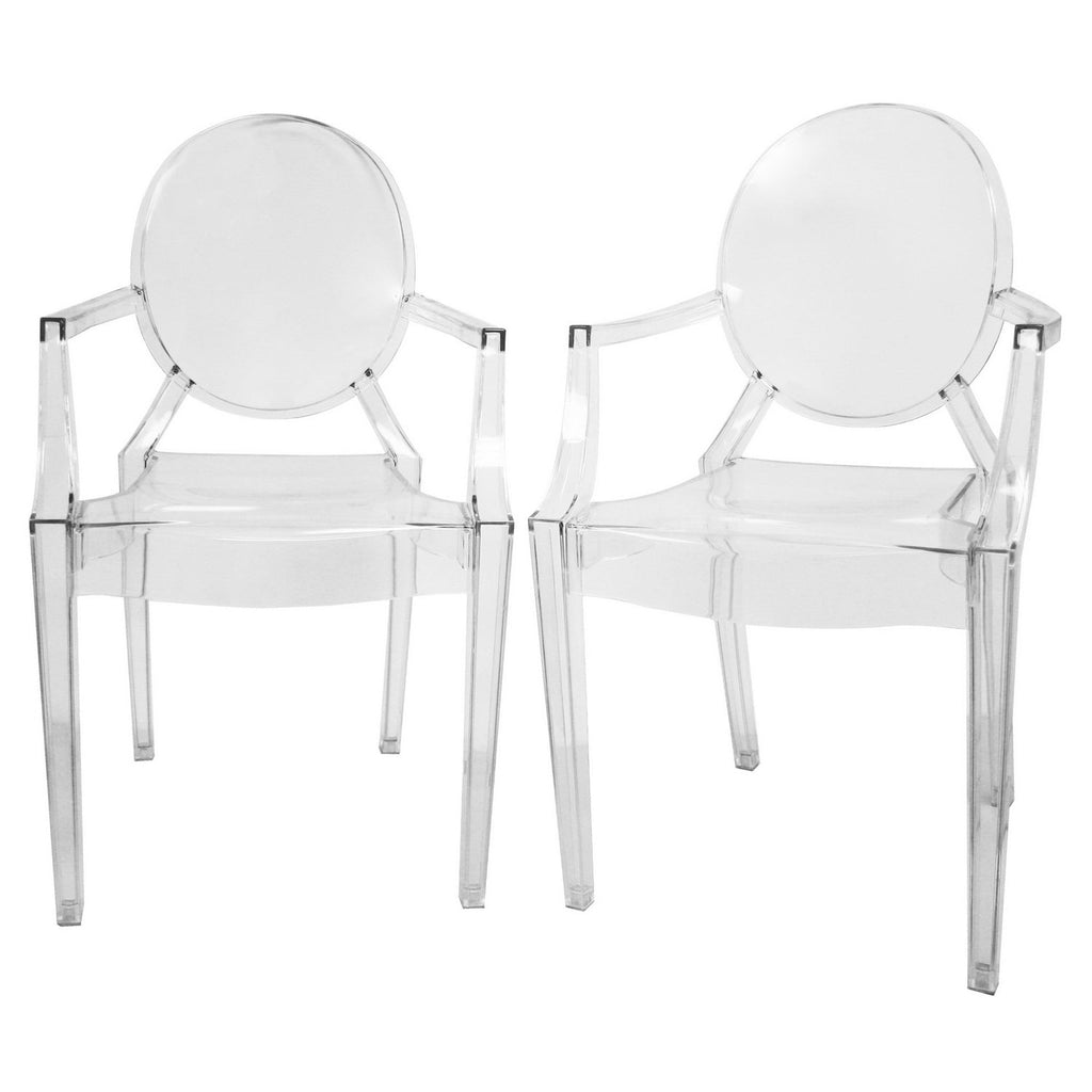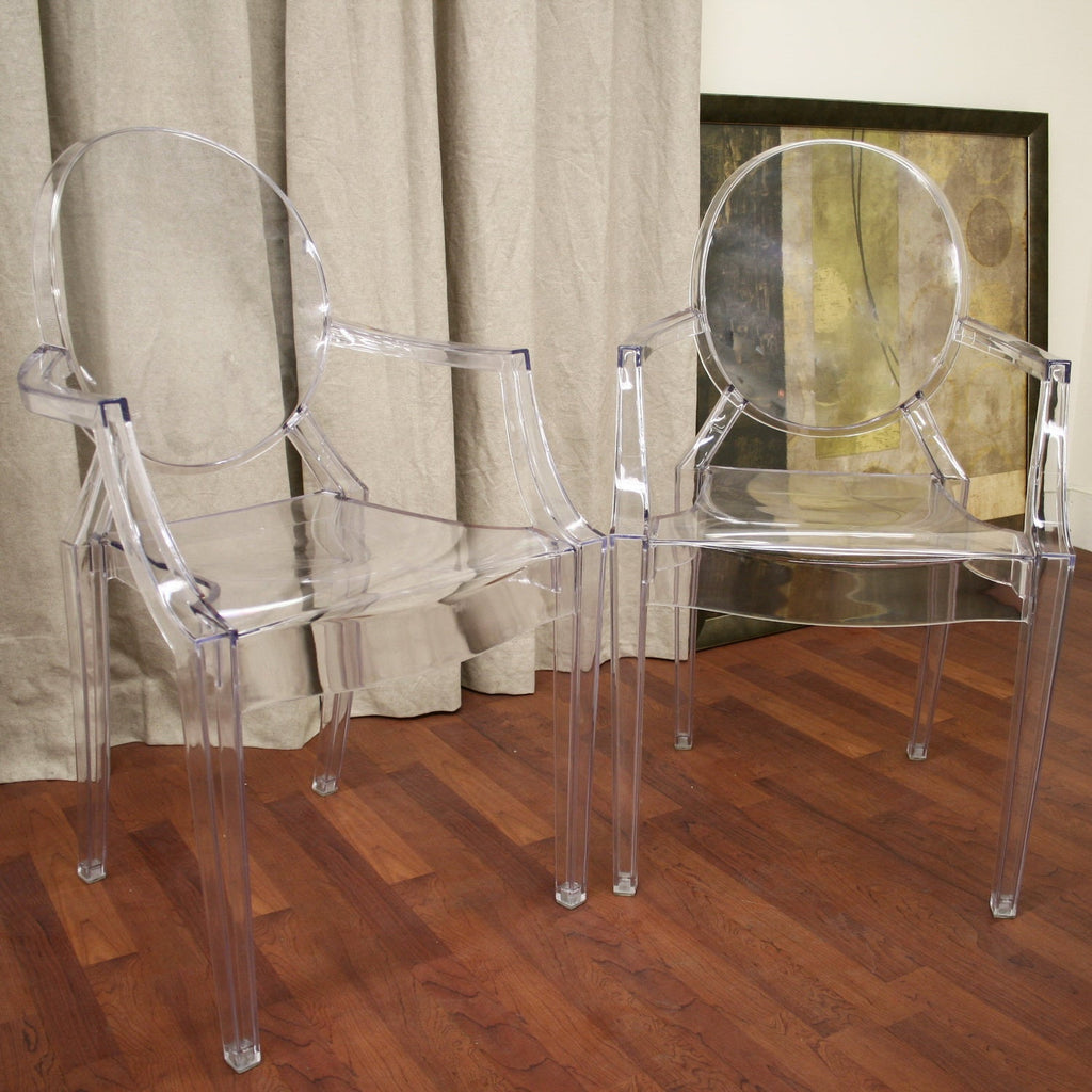 Made of transparent acrylics, the chair is sturdy and durable even as it displays a delicate, ethereal appearance. This versatile arm chair is suitable for indoor and outdoor use.