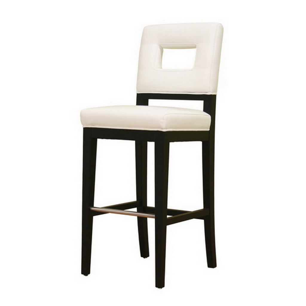 Drawing inspiration from geometry, this contemporary leather bar stool offers a modern update to your home. The frame is sturdily constructed with wood and comfortably padded with foam cushioning. Bright white leather with edges finished in matching piping lends a classic touch to your space and is paired with black legs. Opaque non-marking feet give sensitive flooring additional protection. This item will arrive fully assembled.