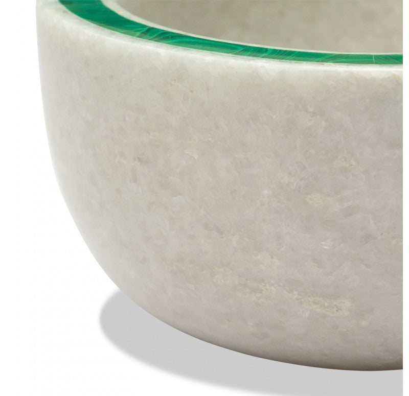 Hand carved white marble with an inlay of mysterious malachite. Angled bowl feature. Expect differences in color, striations and malachite stone inlay shapes. Food safe. Hand wash only. Certain foods can stain and are abrasive to marble. Indoor only. Weight: 5 lbs.