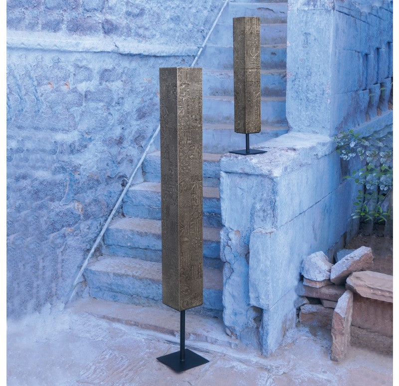 Antiqued aluminum sheet is painstakingly hand hammered, embossed and cladded to carb compliant mdf. Patterns, textures and colors are different on each sculpture. Indoor only. Weight: 9 lbs.
