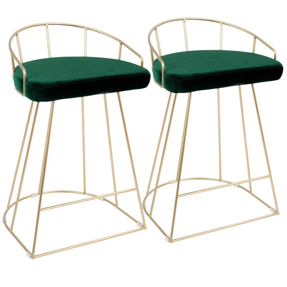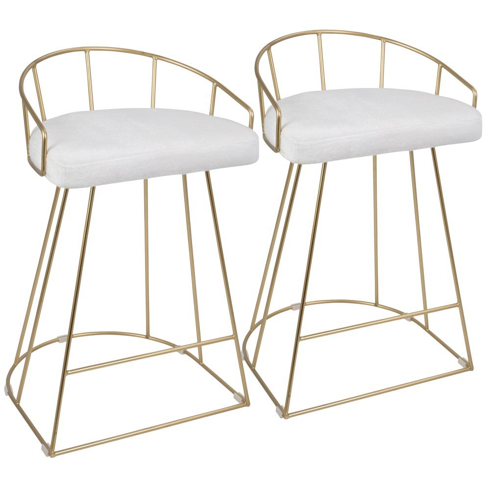 Opulent and confidently contemporary - that's the Canary Counter Stool from LumiSource. Features a captivating cage-like gold tone metal base with footrest, subtle curved backrest, and an elegant upholstered seat available in various modern colors. Definitely a bold touch of fancy for your seating needs.