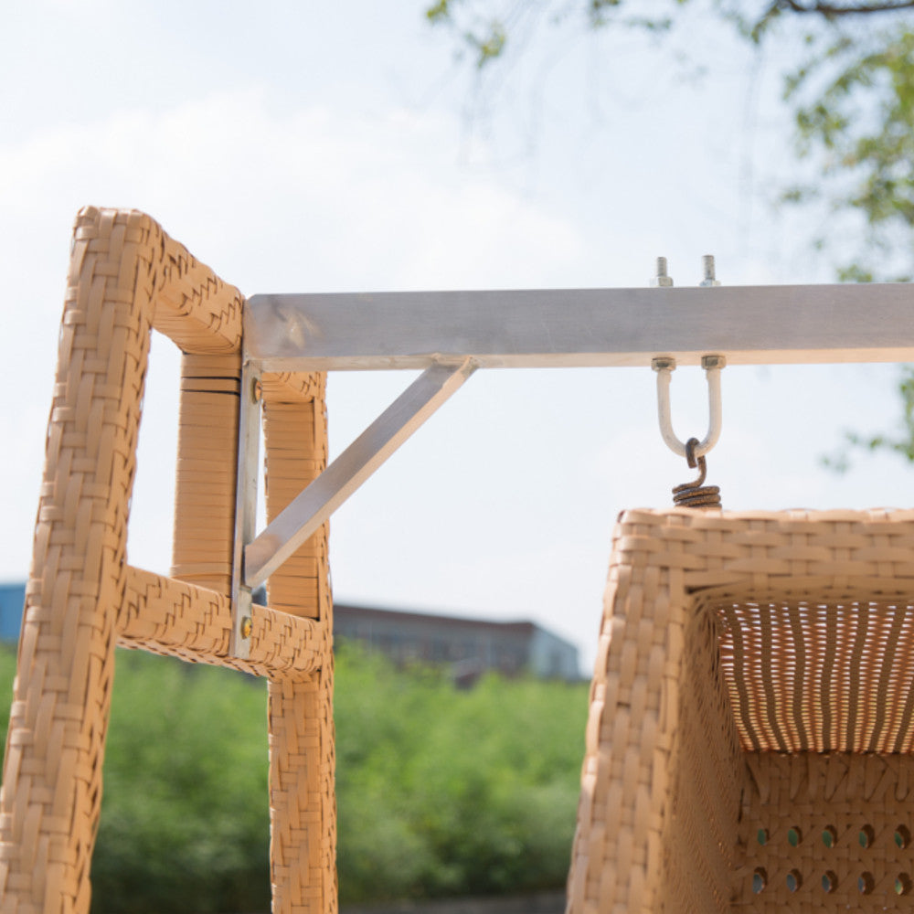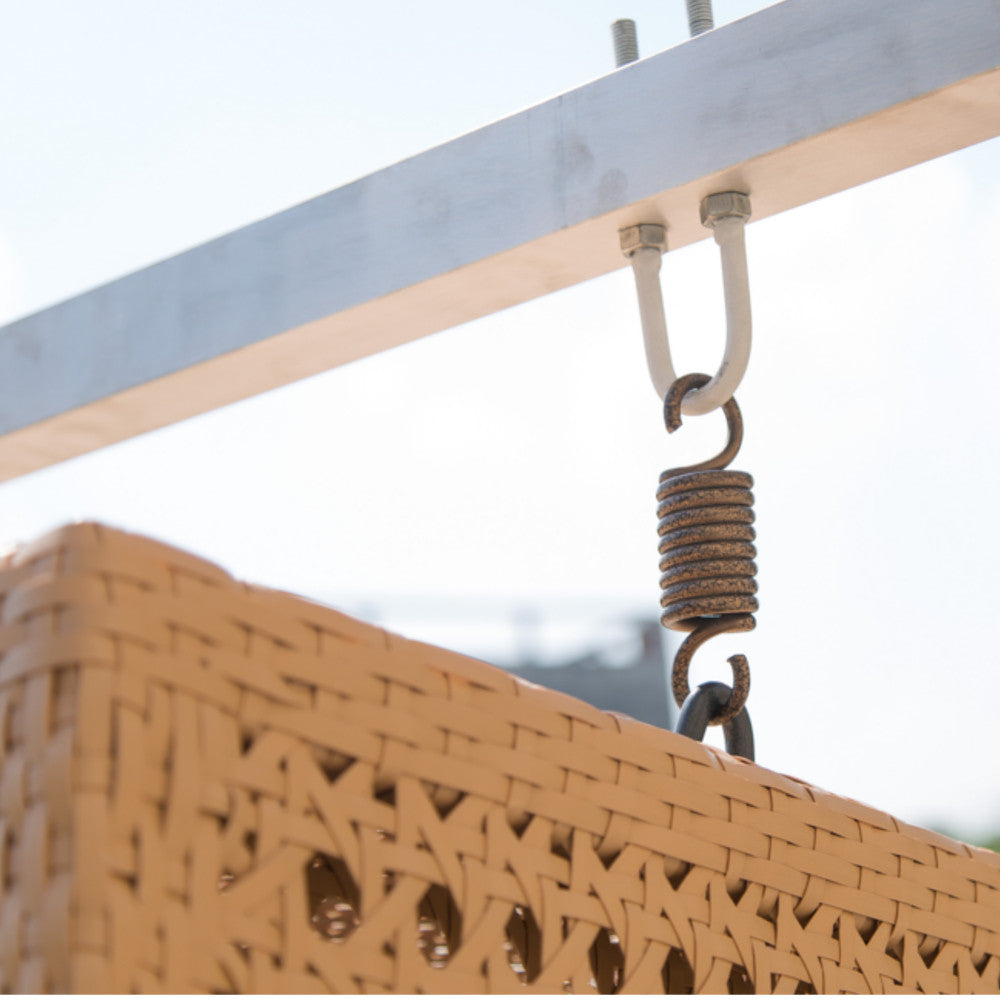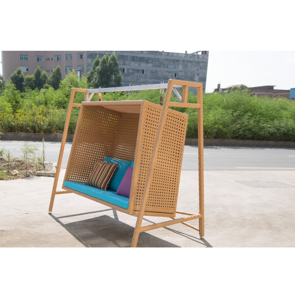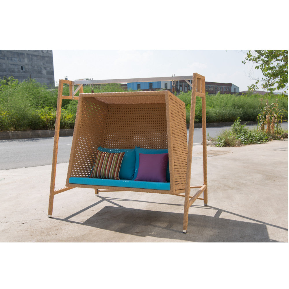 Made of waterproof pe (polyethylene) rattan the hammock loveseat comfortably seats 2. A loveseat is cushioned with an 8cm thick cushion on seat and lower back. 4 decorative pillows are included. Block loveseat hangs on a strong iron frame.