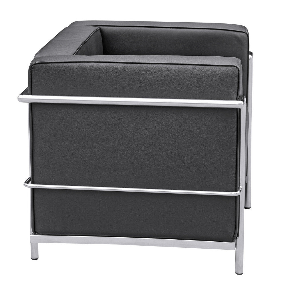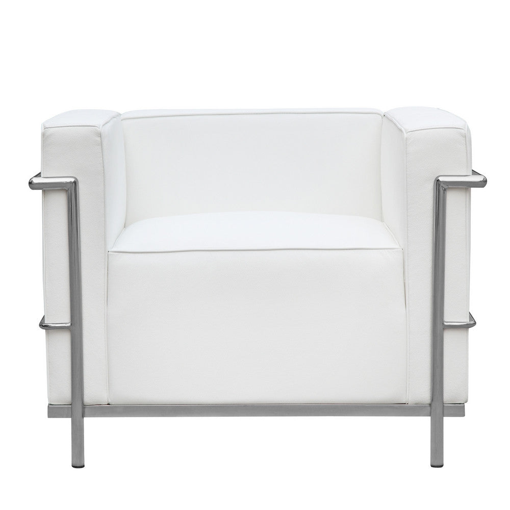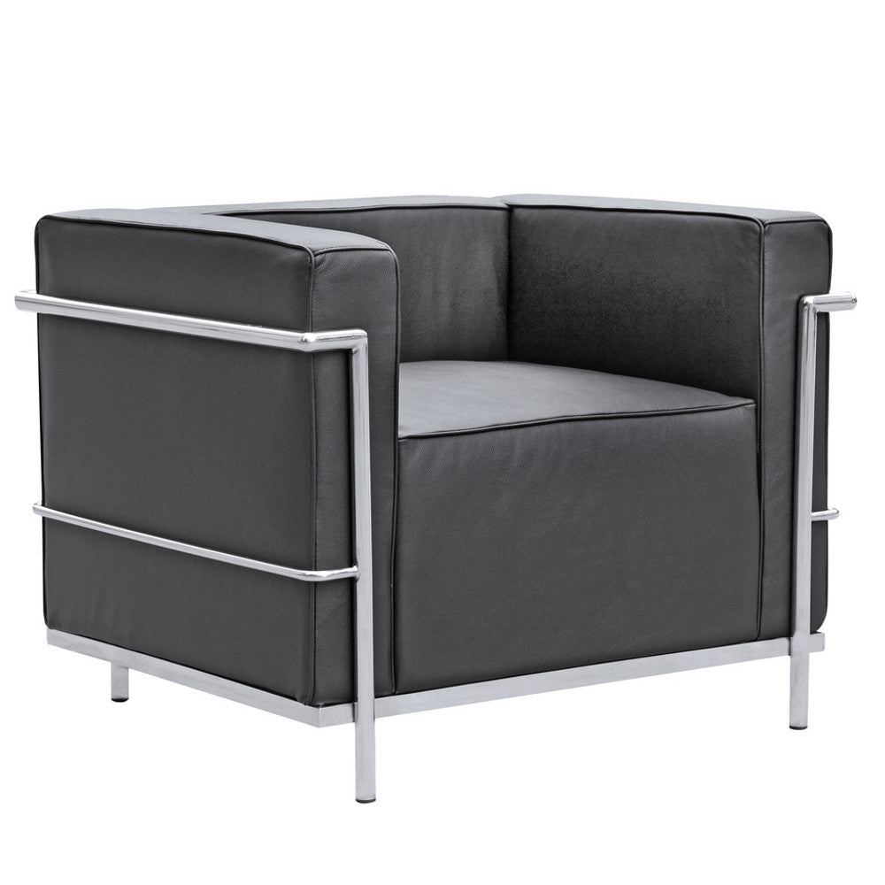 Grand Lc3 Chair is covered in genuine leather on front, sides, back and cushions. Chair has a polished stainless steel frame.