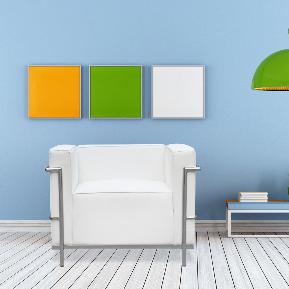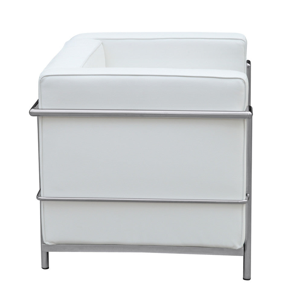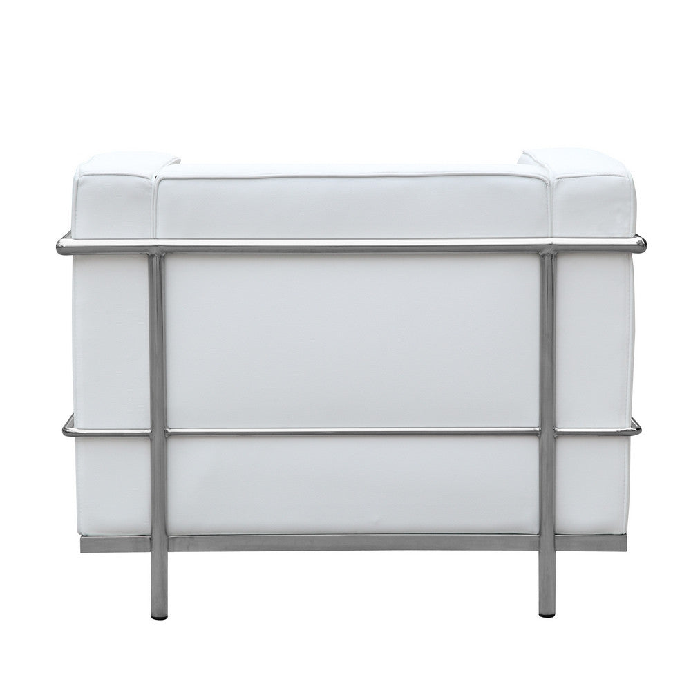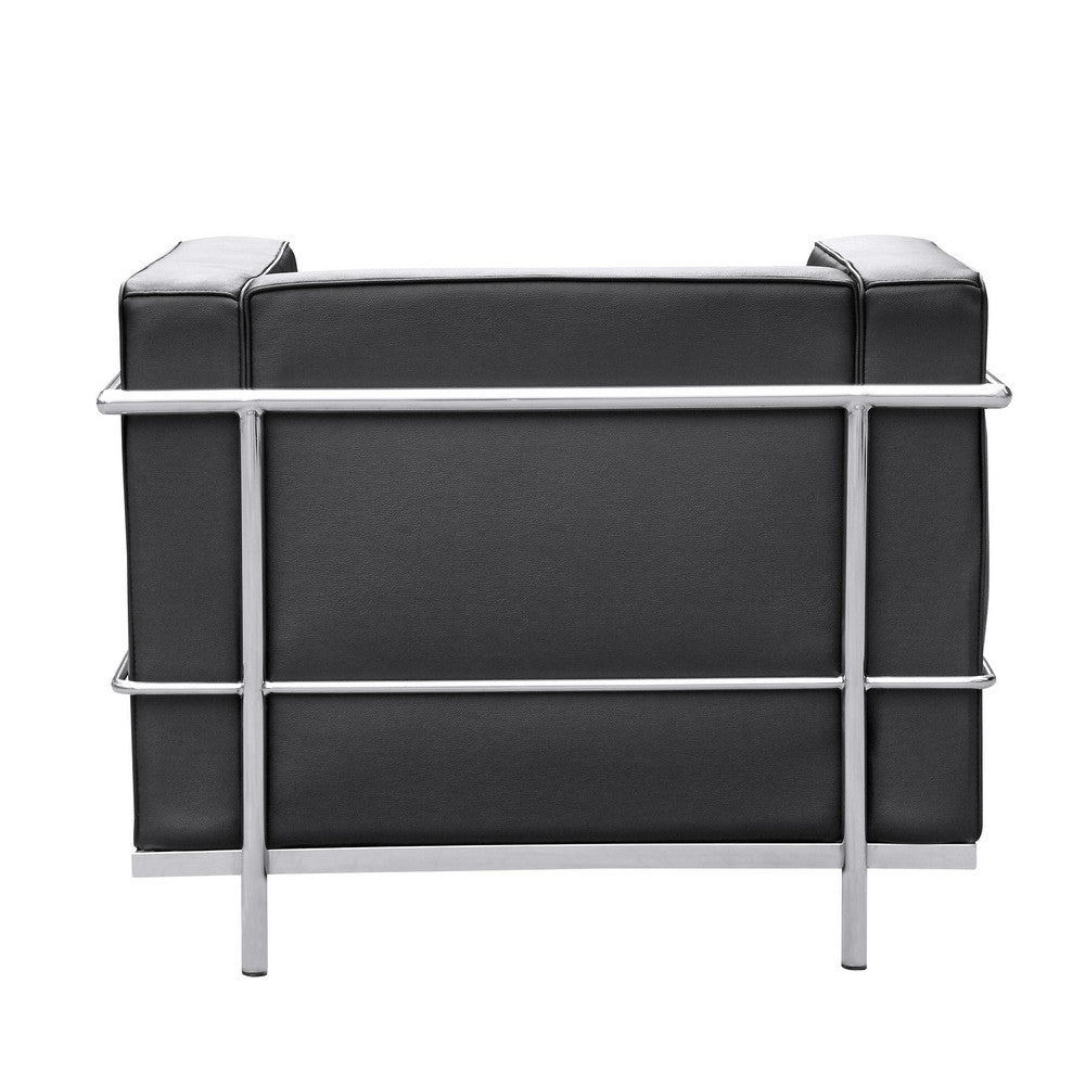 Grand Lc3 Chair is covered in genuine leather on front, sides, back and cushions. Chair has a polished stainless steel frame.