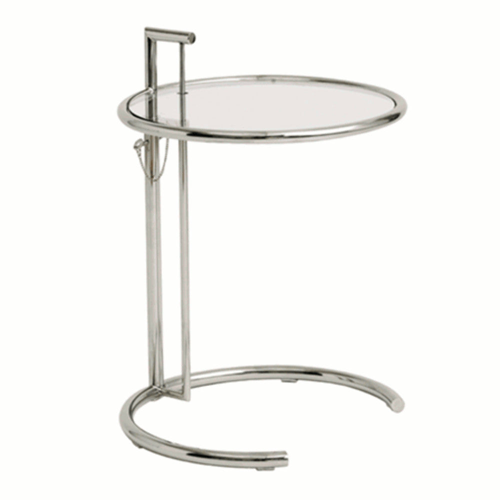 The Round end table features a chrome steel tube, which is fully welded through the top bar and extends through it for exceptional durability and original detailing. This table also features tempered glass and adjustable height positions.