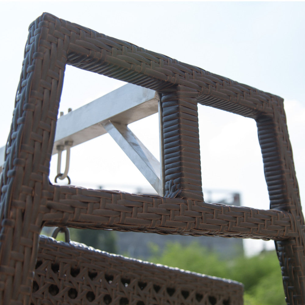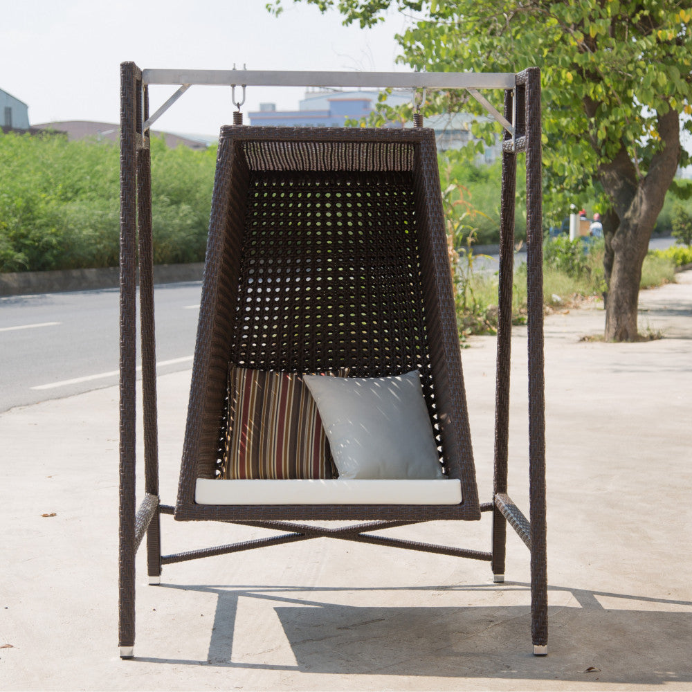 Made of waterproof pe (polyethylene) rattan the Secure Hanging Set is a comfortable relaxing swing with gentle movement. Seat is cushioned with an 8cm thick cushion. 4 decorative pillows are included. Chair hangs on a strong iron frame.