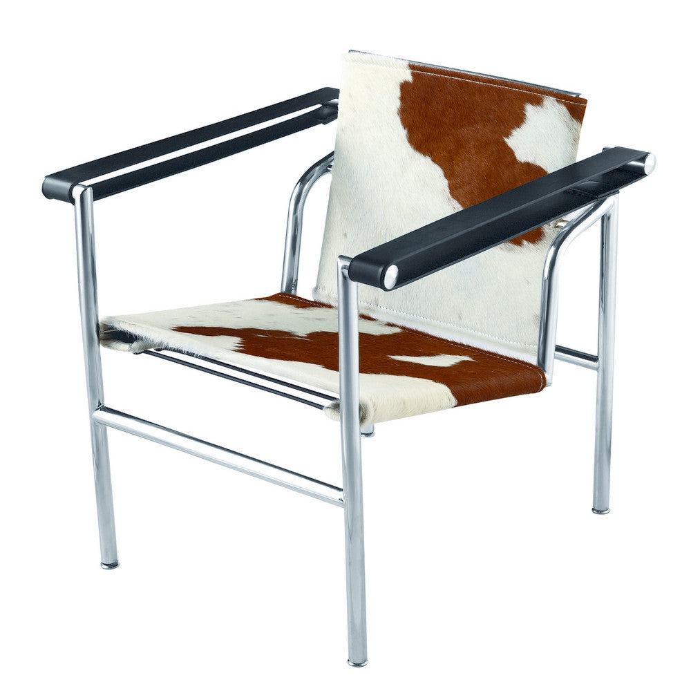 Seamless tubular steel with a polished chrome finish, with Soft Thick cowhide pony skin upholstery available in black and white or in brown and white.