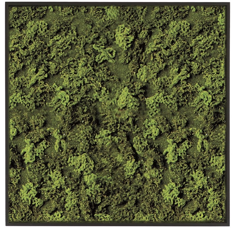 Satin black painted hardwood with wood grain texture. Open front, no glass. Made to order. 4- 6 week production time upon receipt of 60% down payment. Our system allows almost any size of vertical surface to become a green wall. We are sorry if some components are out of stock at time of purchase. To meet your delivery, we can easily substitute a similar moss. Exterior dimensions. Security hardware included. Indoor only. Truck shipping.