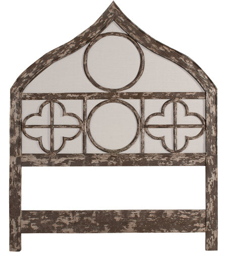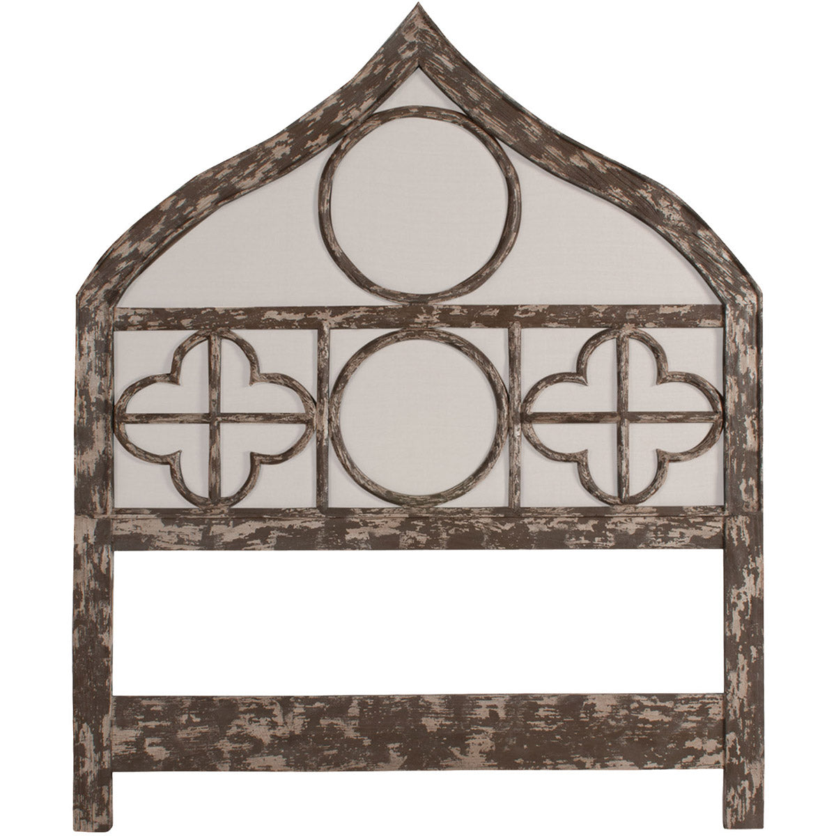 Potting Shed Gris finish on hand-carved gothic headboard with linen back panel.