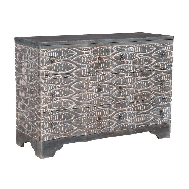 Waterfront Grey Stain finish with white hang up on six drawer chest with silver ring pulls.