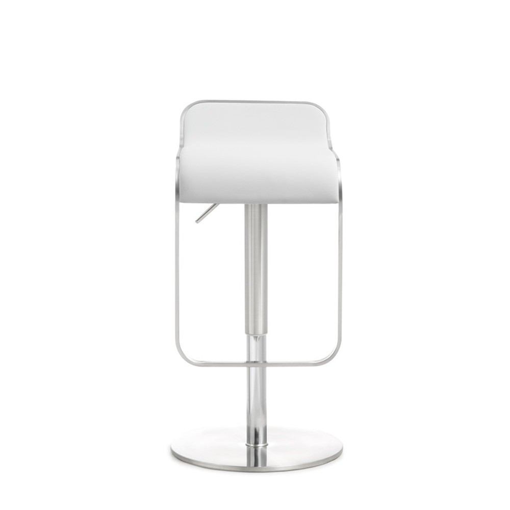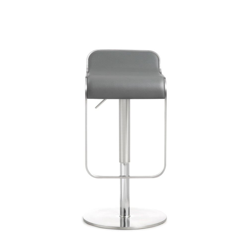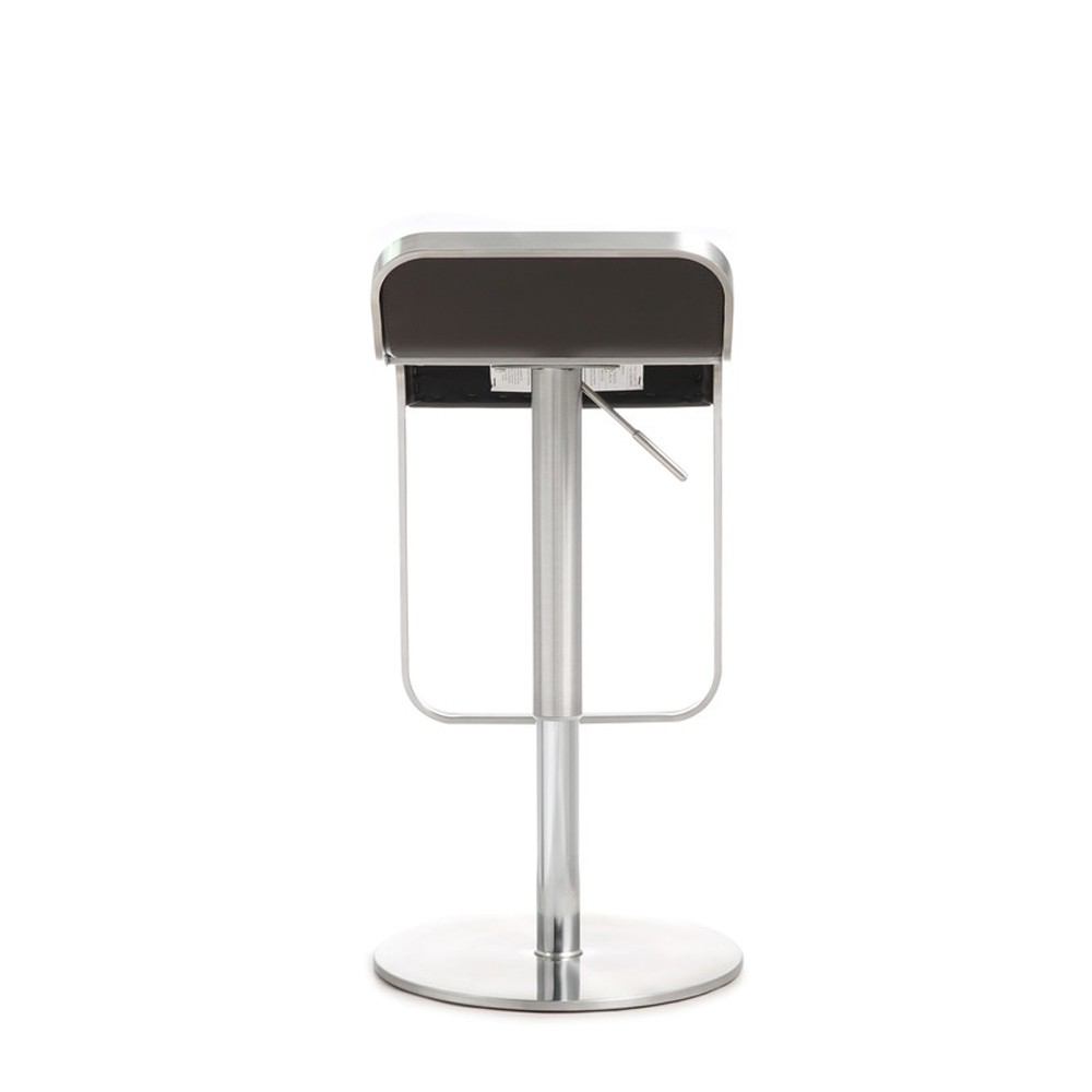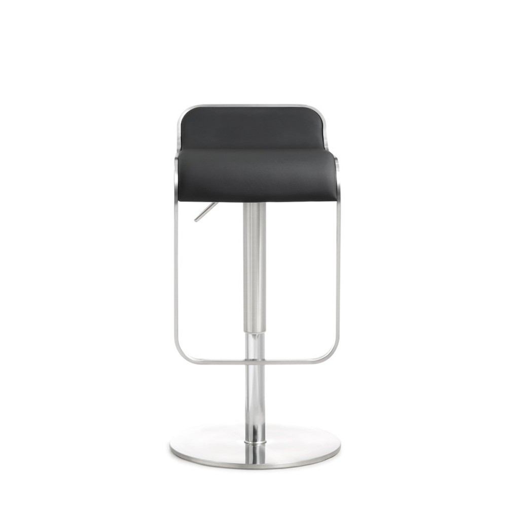 The Anthony hydraulic stool is crafted with a thick leatherette covered seat, a chromed steel frame and footrest and an ample diameter polished stainless steel base. These modern barstools have an adjustable seat height via a gas lift for use as a counter or bar-height stool. They arrive fully assembled, available in black, gray or white leatherette and have a swivel seat.