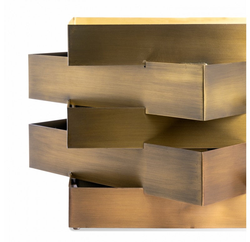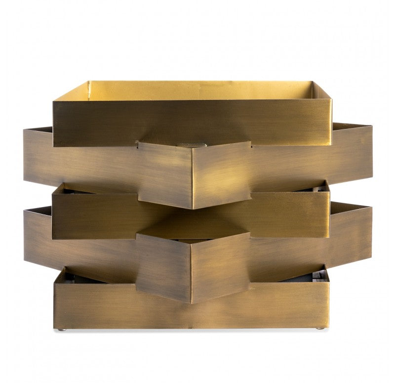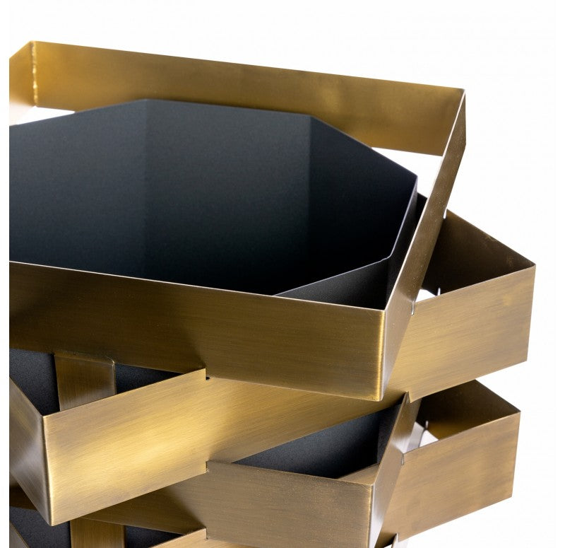 Hand assembled of multiple parts. Antique gold finish. Removable tube vase/ planter. Best if liner is used. Protect table surface. Truck shipping. Indoor only. Weight: 10.6 lbs.