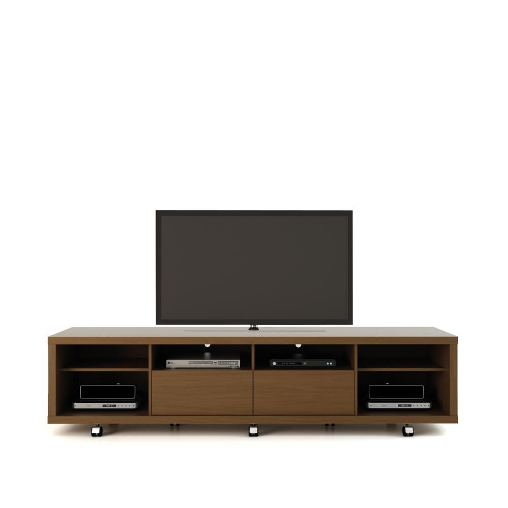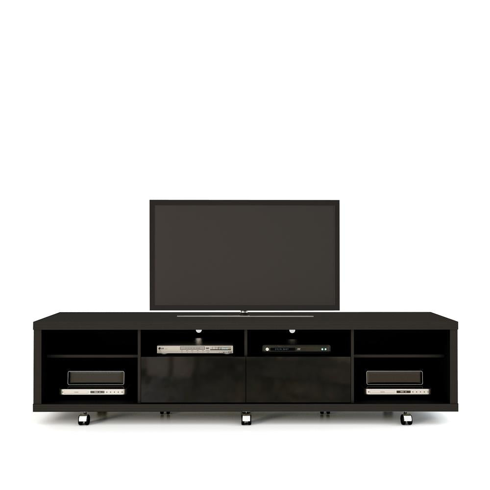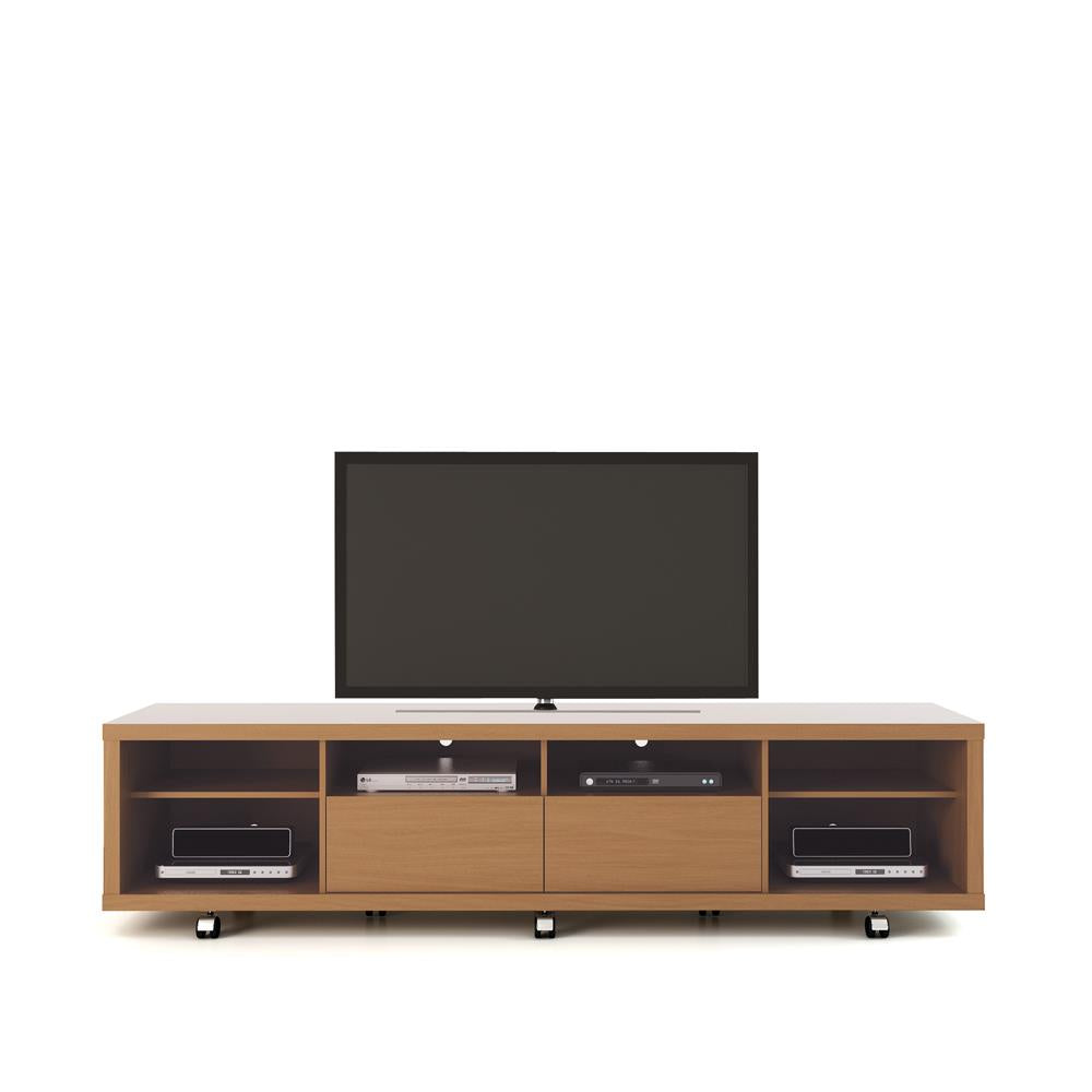 Easily maneuver the Cabrini TV Stand 2.2 into place, with the convenient wheels for hassle-free arrangement. Mount your TV directly on the wall, or pair Cabrini TV Stand with the Cabrini TV Panel for a more finished look. The TV stand is built with 6 roomy cubbyholes and 2 sliding drawers to manage your clutter. Choose between a high-gloss finish in black or white, or a pro-touch matte finish in natural wood hues. Our unique finishes allow easy cleaning, so your TV stand always looks shiny and new.
