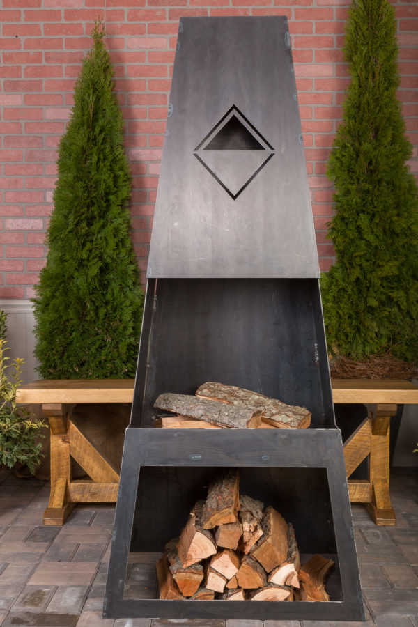 Hand worked steel European style outdoor fireplace. Made from solid 12 gauge heavy duty steel that will last for years and years without any maintenance. Truly a one of a kind works of art and terrific conversation pieces to go along with any outdoor decor.