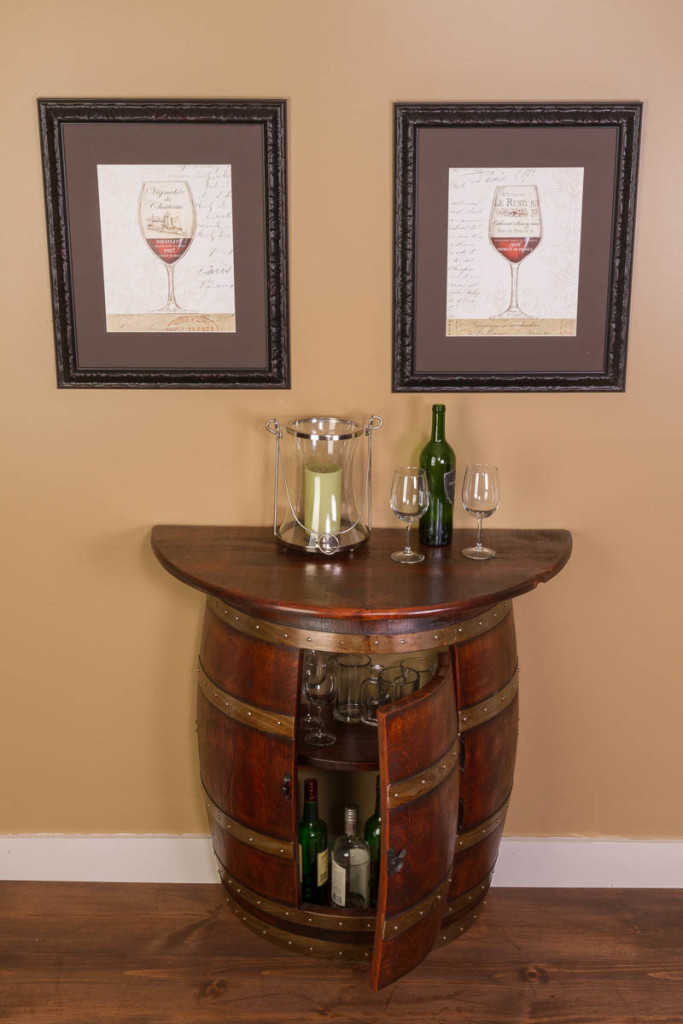 Half Barrel Wall Cabinet with pine top is beautifully handcrafted from half of a retired French oak wine barrel from Napa. Cabinet features a bottom and middle shelf. Cabinet door is hinged with a latch.