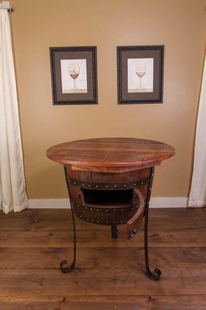 This very functional fine handcrafted table has tons of character and charm. 35" diameter top made from a wonderfully distressed solid white oak top. The base is constructed from half a wine barrel and has a hinged door with storage inside. Table legs are 3/8" thick by 2" wide hand-worked iron.