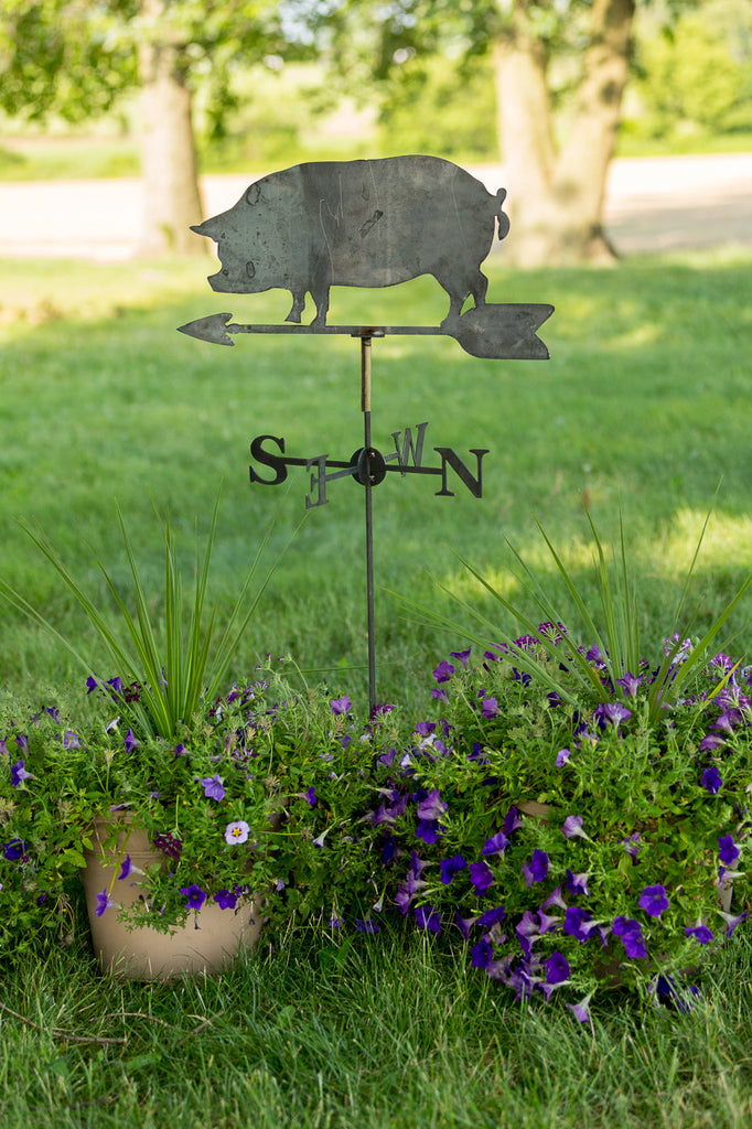 Weather Vanes are constructed of 12 gauge steel and are 24� by approximately 15�. Step stakes are 30�H. Total height when in the ground is 36�. Table top versions are the same measurement but sit on a 4� stand instead of a step stake.