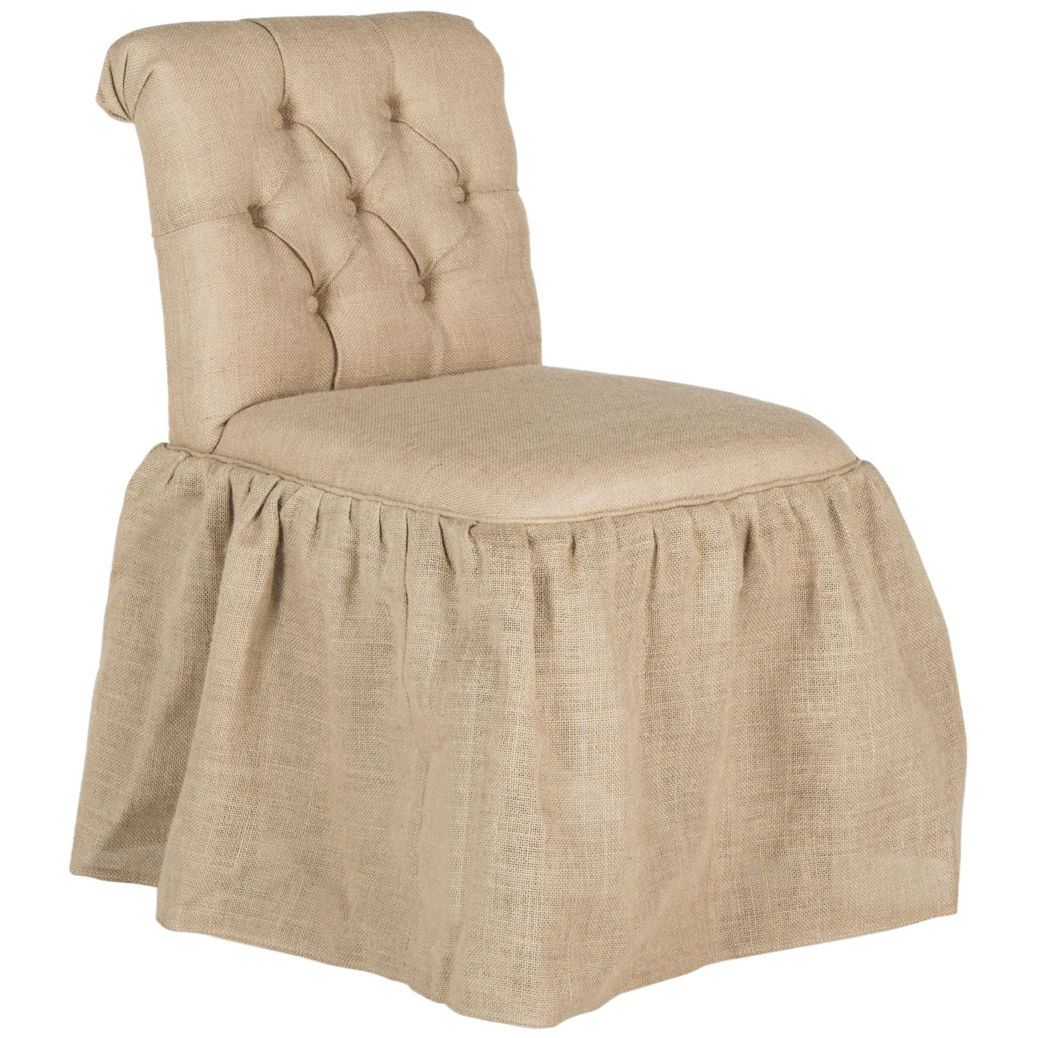 The ultimate luxury, this designer vanity chair is upholstered in taupe linen fabric with all the elegant touches of a custom piece. Biscuit button tufting adds drama to the rolled edge backrest, while a full ruffled skirt lends an air of romance.