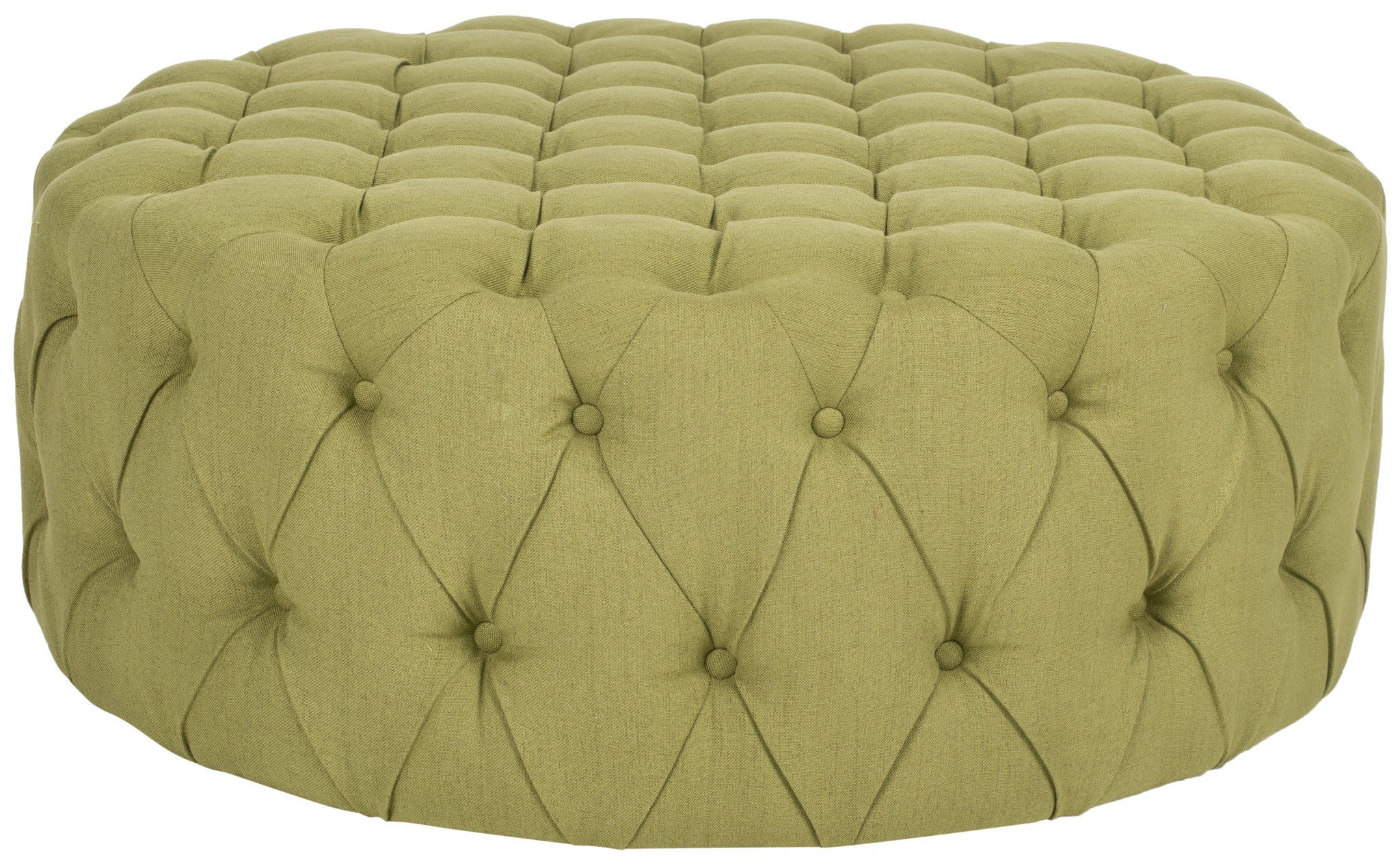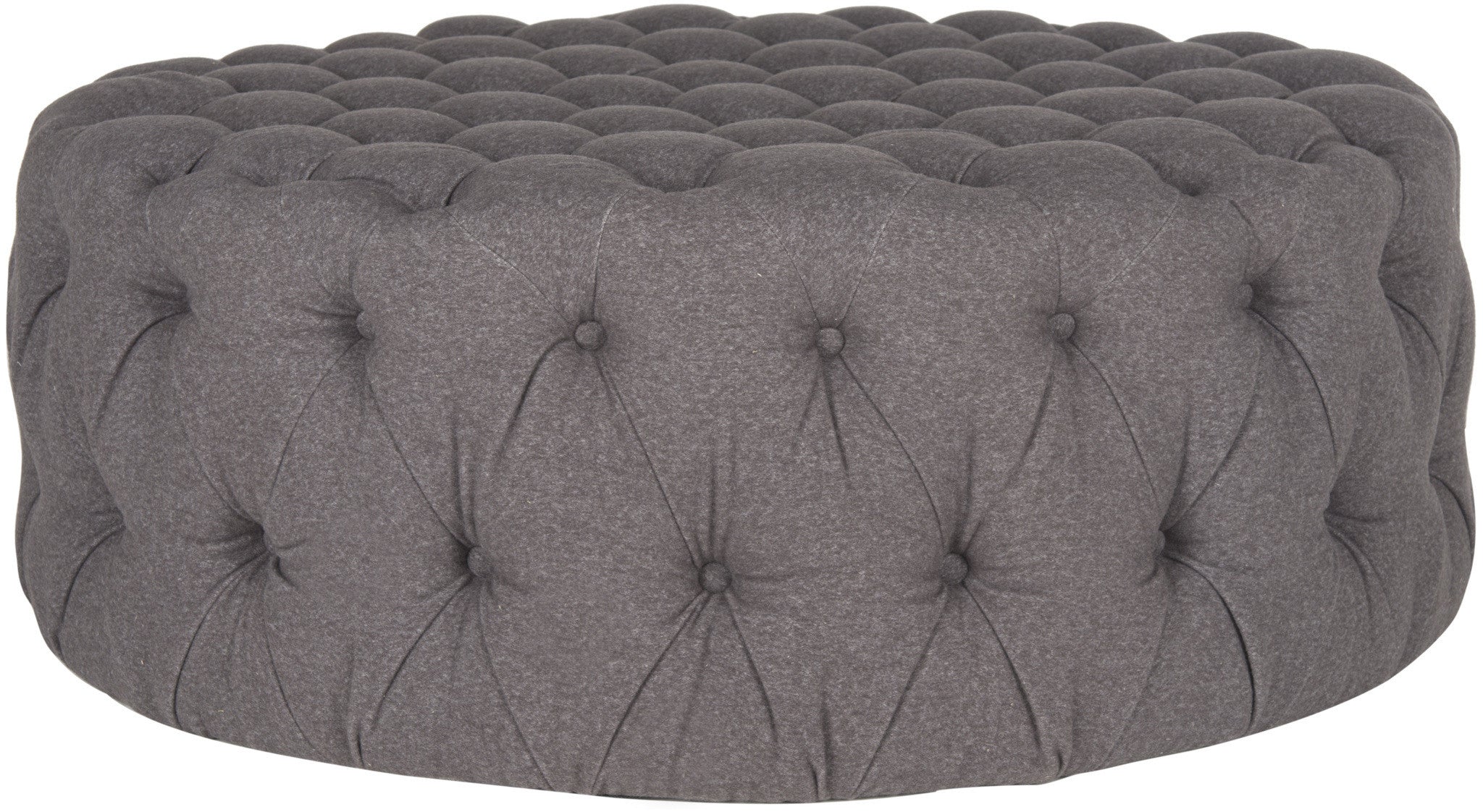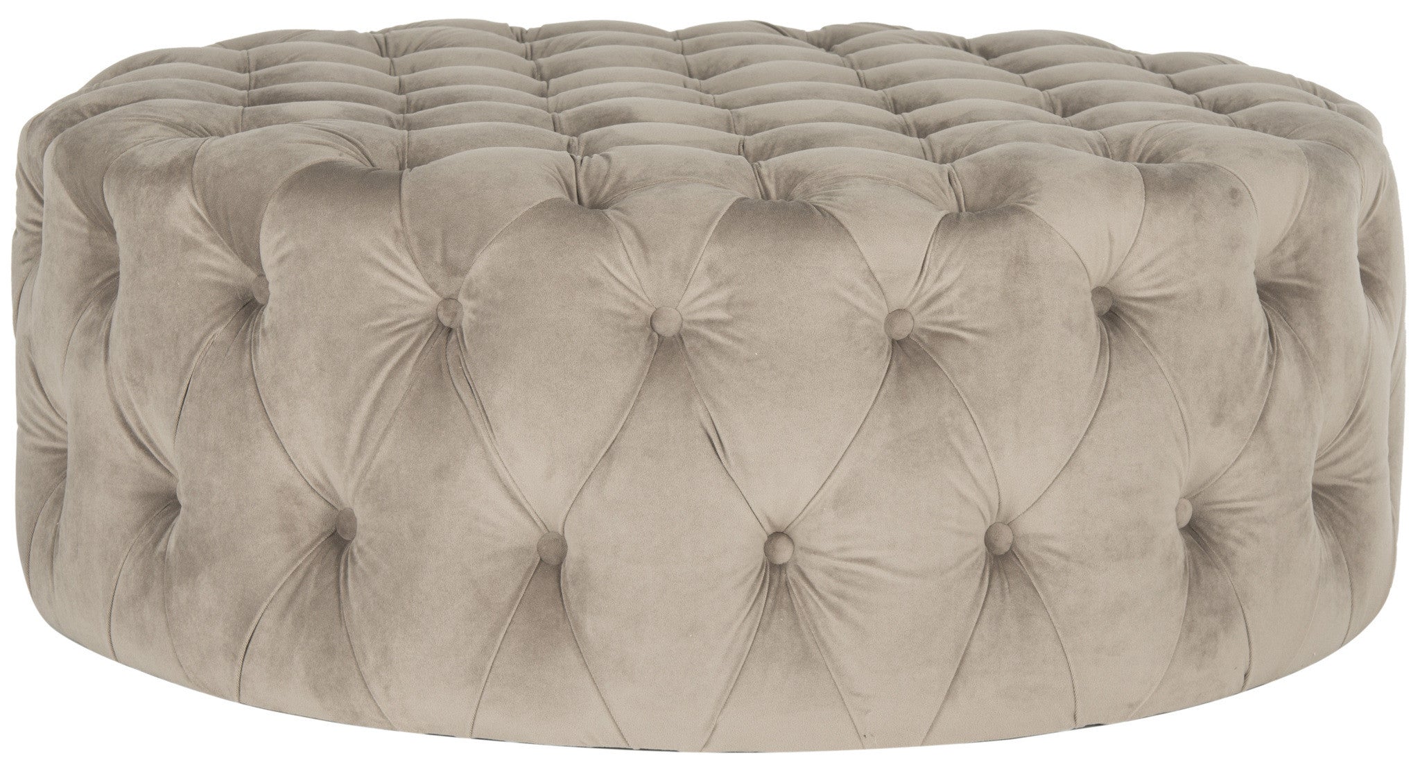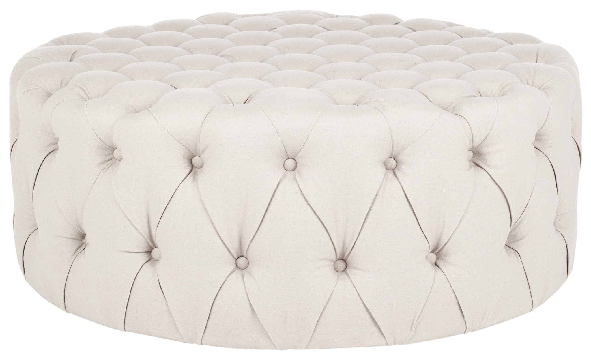 Brimming with sophistication, the elegant Charlene Ottoman recalls the 1930s Hollywood glamour with its lavish taupe linen fabric button-tufted on all sides. The oversized round shape and foam fill create a wonderful surface for use as a coffee table or extra seating.
