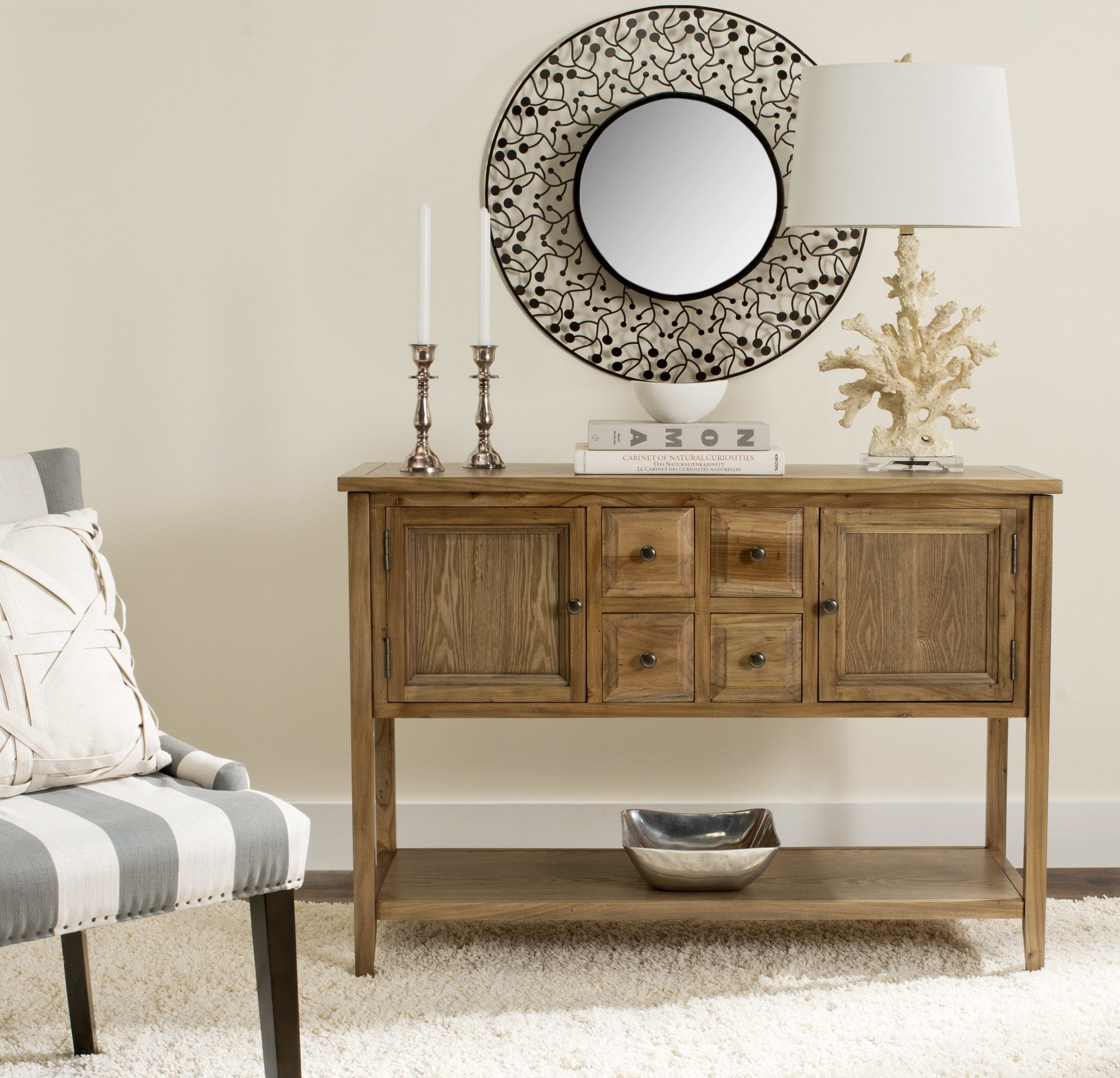 Charlotte is a godsend for those in dire need of extra storage. The sideboard, with its charming rustic medium honey oak finish and crafted from solid elm wood, features four drawers, two cabinets and bottom shelf. Charlotte proves the perfect companion to country styled kitchens, living rooms and dens. MiNr assembly required.