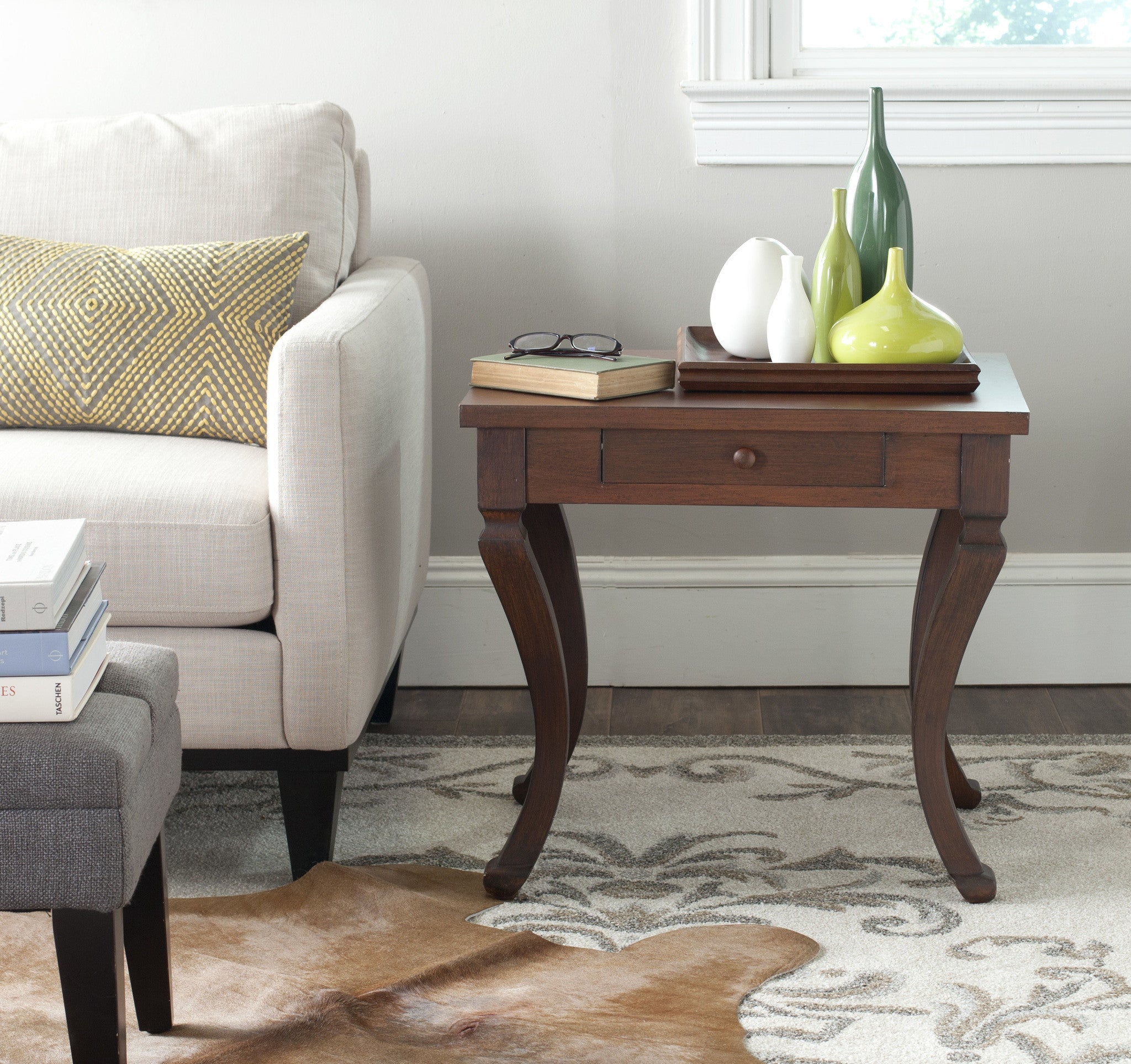 Pretty and petite, the Colman side table is the ideal accent in transitional or country interiors. With its single drawer and updated cabriole legs, this rich brown fir wood table works equally well beside a sofa, chair or on either side of a bed.
