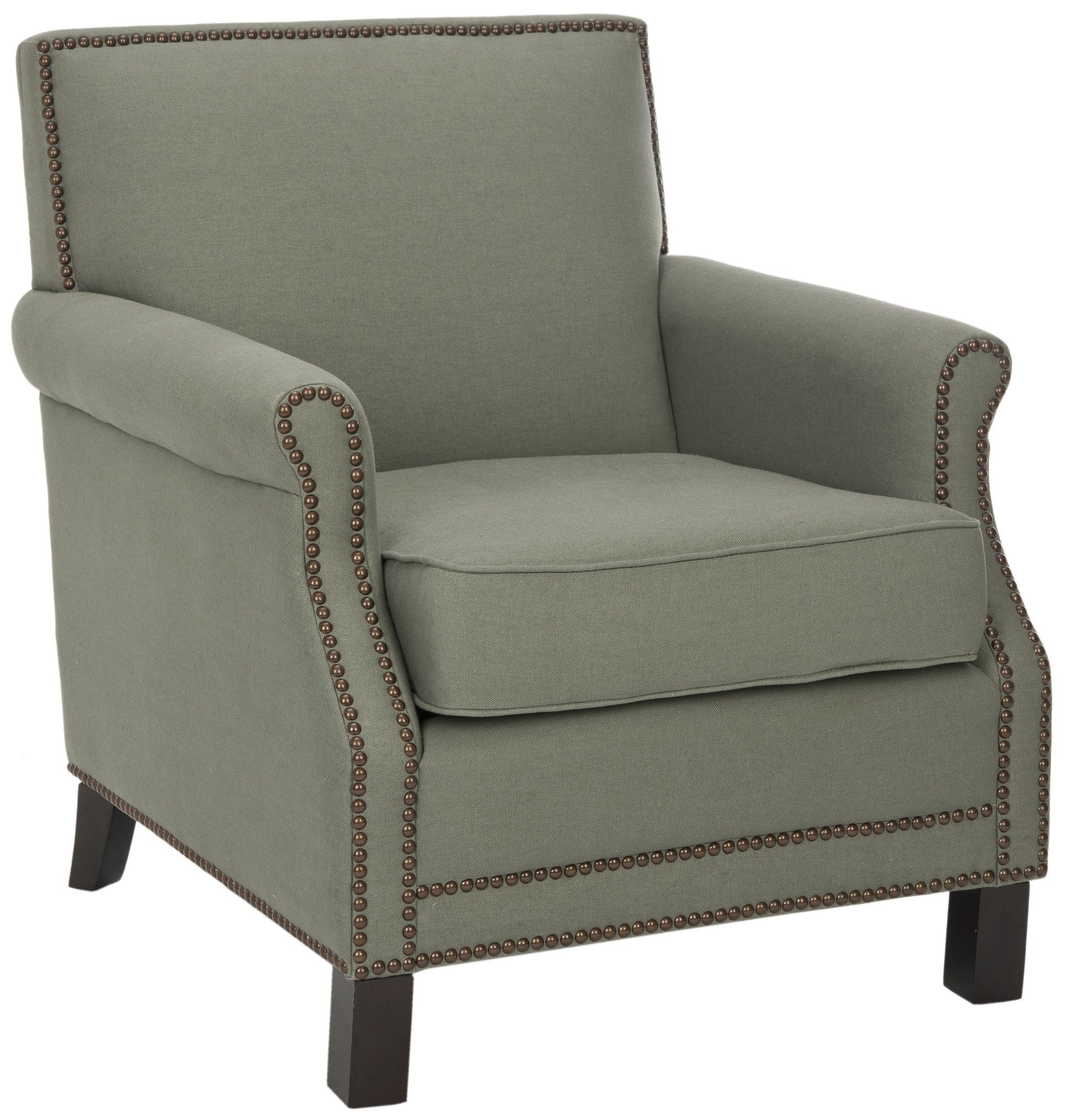 The distinguished Easton chair, with slender frame, roll arms and brass nail head details, is a fireside classic. Upholstered in pure linen fabric in sea mist and standing on straight birch wood legs with a dark java finish, this comfy club chair is an easy-going version of the den and library favorite. Designed for small spaces, the transitional Easton chair adapts to traditional, country and soft contemporary settings with ease.
