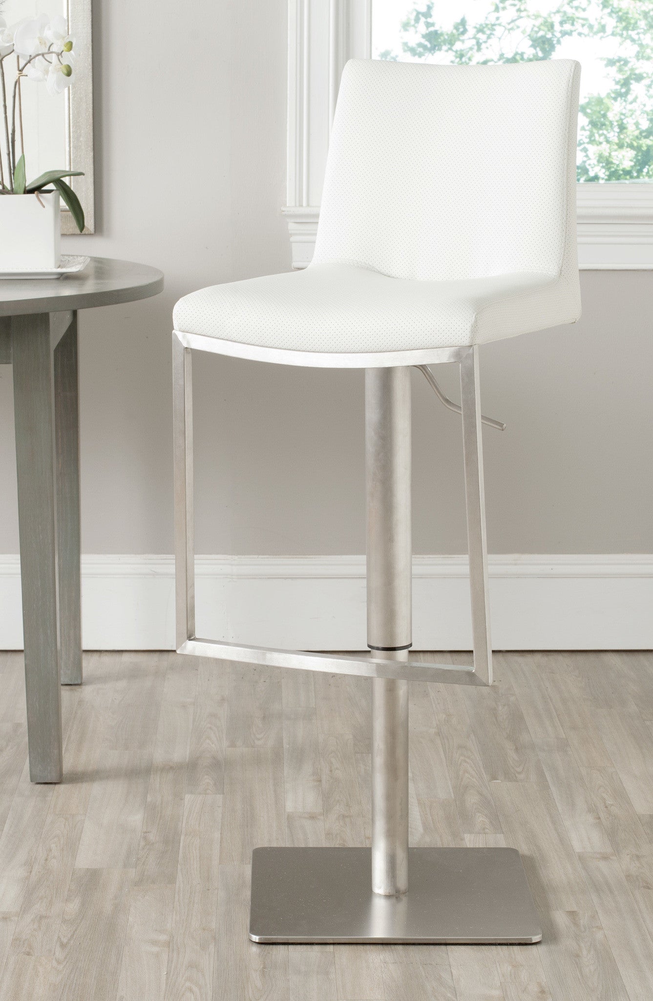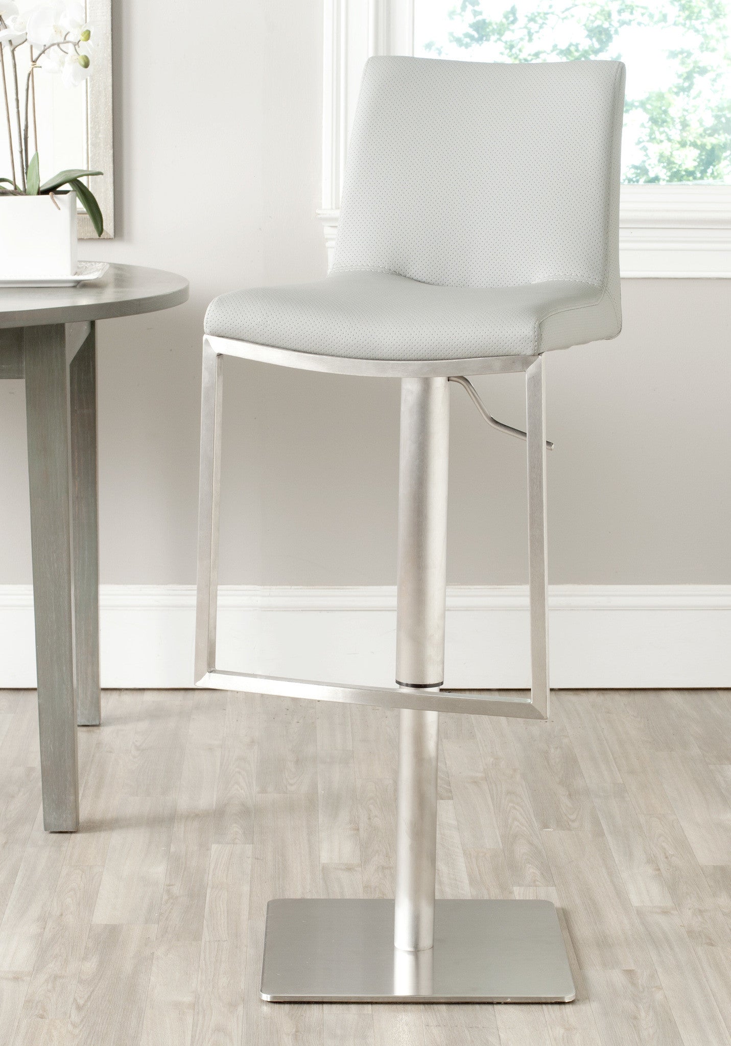 Borrowing from the advanced techNlogy of luxury car makers, Safavieh upholsters the Ember Swivel Barstool with brown perforated PU leather that keeps seats cooler. An adjustable seat height makes this beautiful stainless steel barstool even more comfortable.