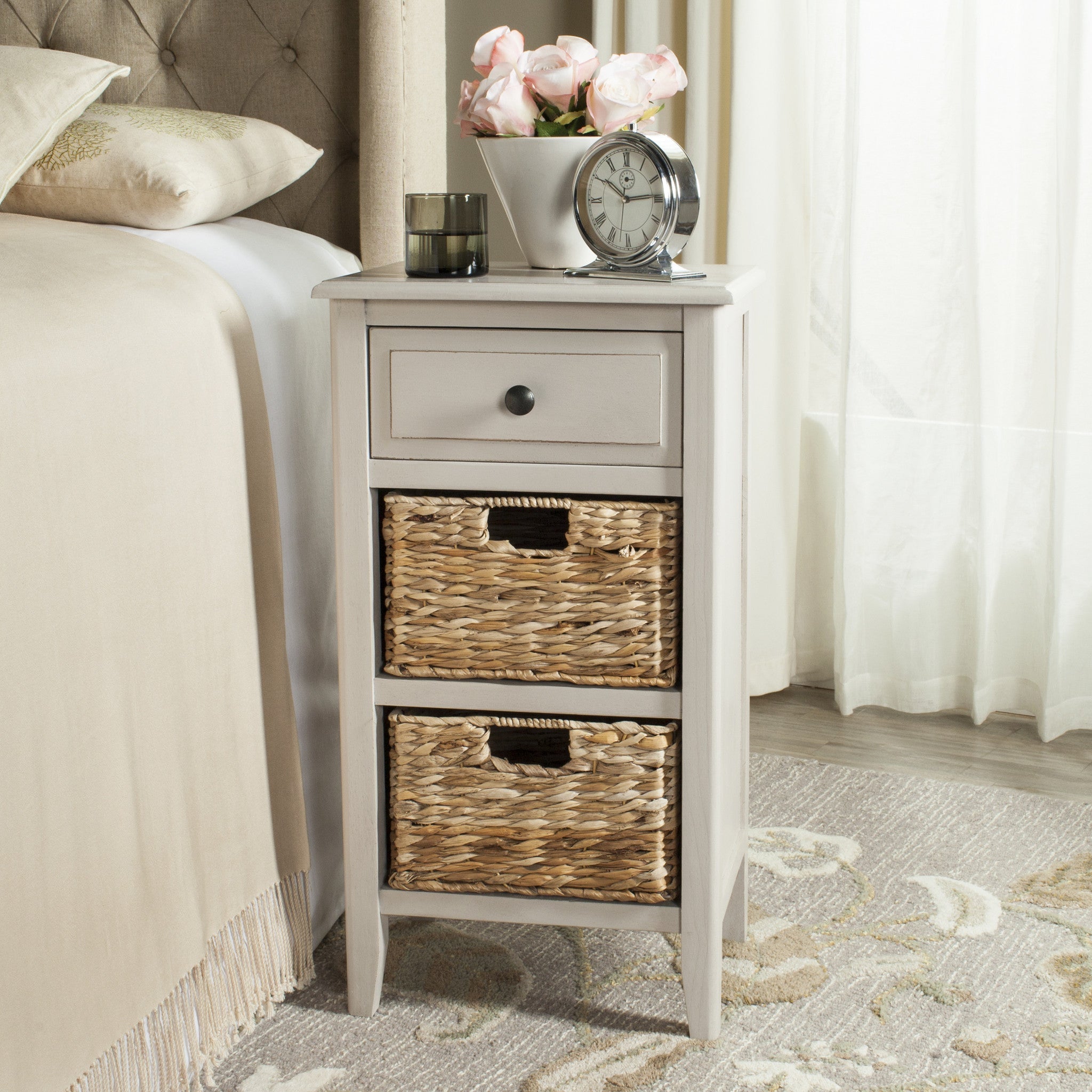 A neat little side table with top drawer and two removable woven rattan baskets with cutout handles, this distressed black piece is brimming with storage space. Crafted of pine in distressed black finish, it makes finding what you need easier than ever.