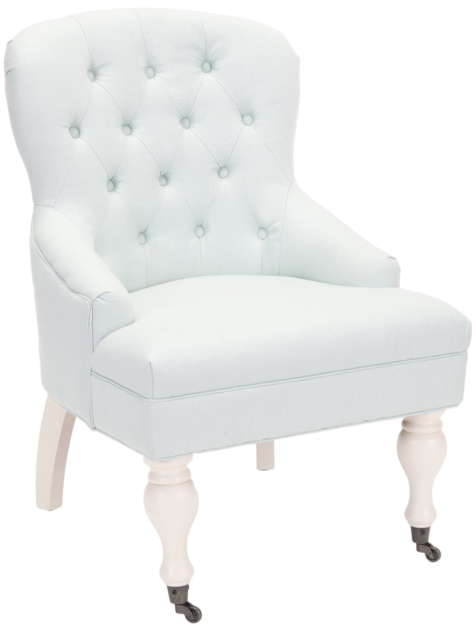 Charming in every designer detail, the petite Falcon arm chair recalls richly upholstered parlor and boudoir chairs from a gentler bygone era. Replete with traditional details, Falcon is updated with biscuit tufted pure linen upholstery in fashionable taupe, and features sloped arms. Birch wood spindle legs are finished in cherry mahogany and come with front casters for easy mobility.
