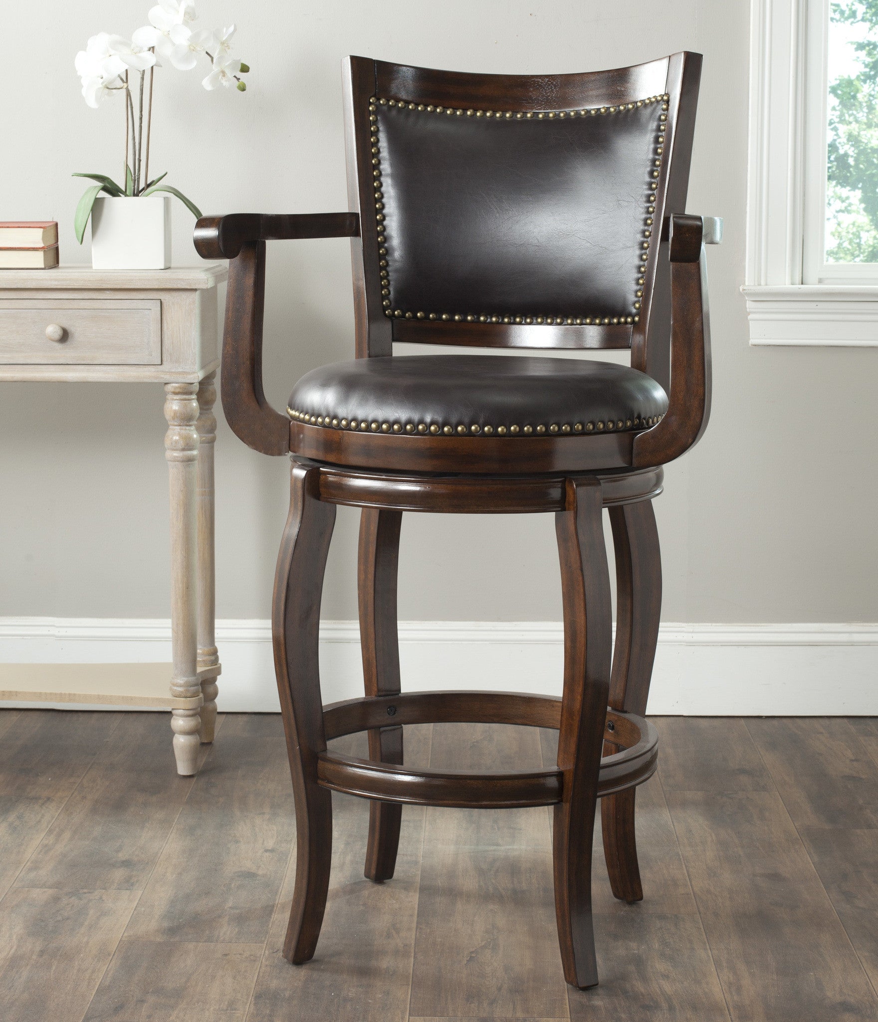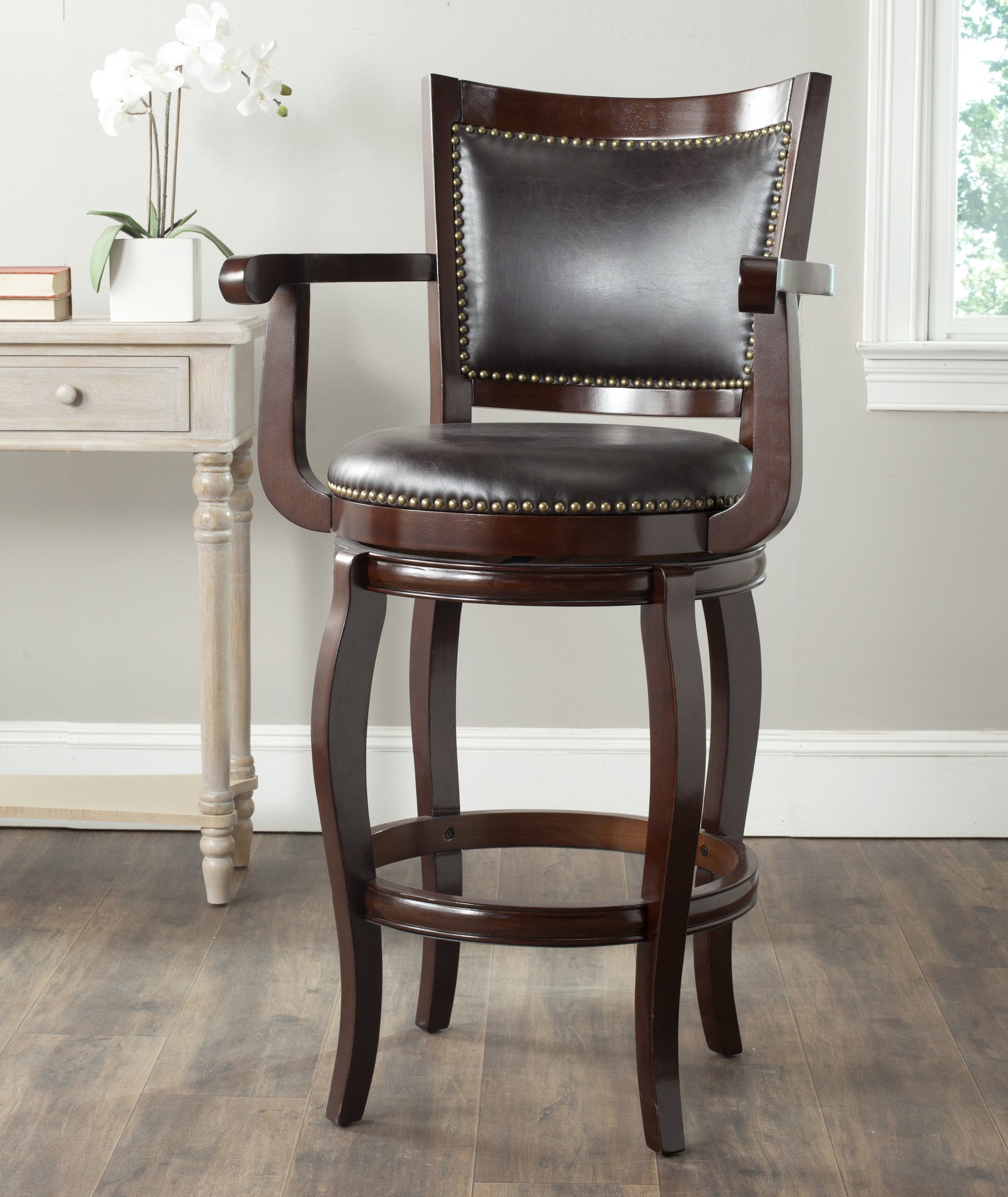 Timeless with a Euro-chic edge, the GitaN Swivel Barstool gives a classic silhouette an update for transitional rooms. Upholstered with dark brown PU leather with bronze nailhead trim, GitaN is crafted of eco-friendly rubberwood in sierra brown.