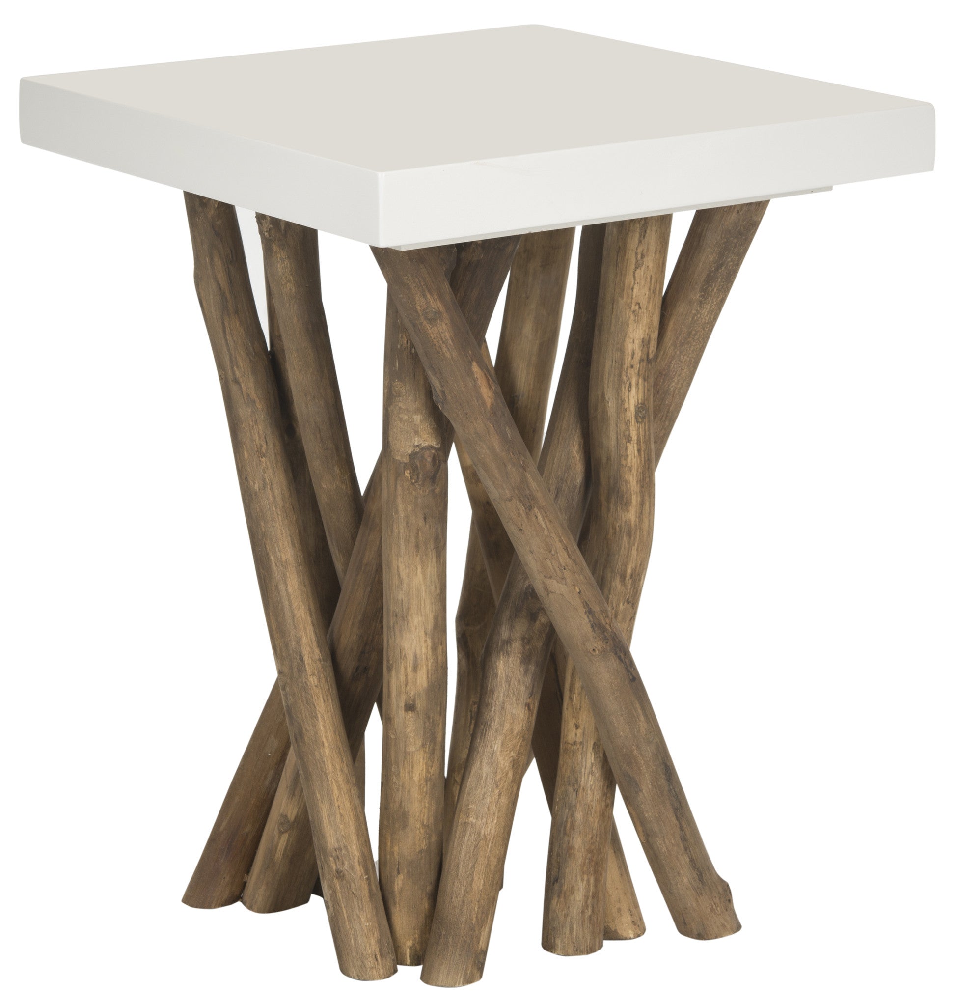 Juxtaposing legs of reclaimed teak branches and a sleek modern white top, the Hartwick side table is truly transitional. Use this unique conversation piece beside a chair in a living room, bedroom or family room.