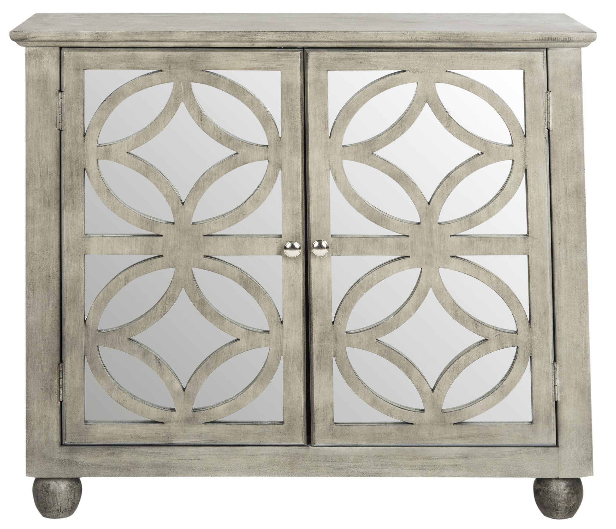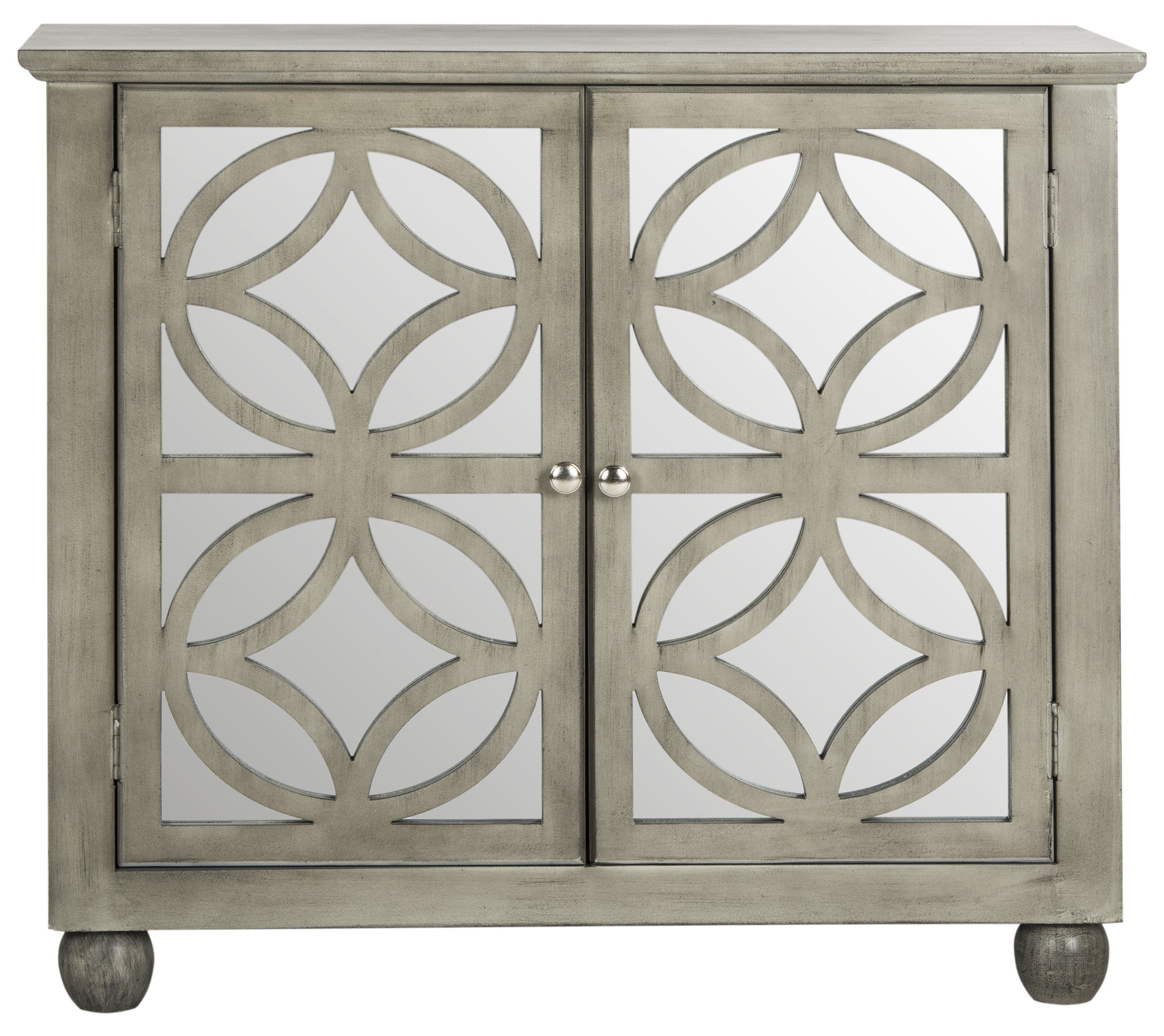 Fashion-forward in both color and silhouette, this glamourous chest combines mirrored doors overlaid with an artful cutout wood motif and a frame finished in a chic new shade of grey. Use this transitional chest in any room in need of stylish storage.