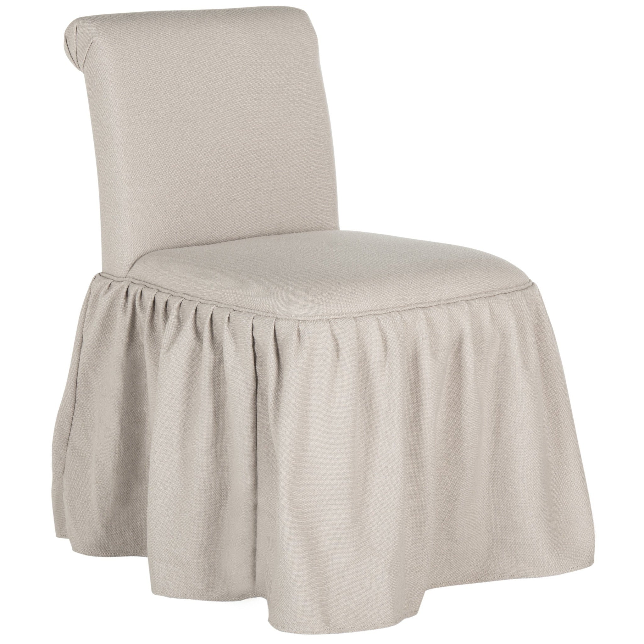 Romantically feminine, this taupe linen upholstered vanity chair brings a soft, refined look to the bedroom or master bath. With rolled edge back, dressmaker piping and softly ruffled skirt, this vanity stool is the pretty, comfortable and functional.
