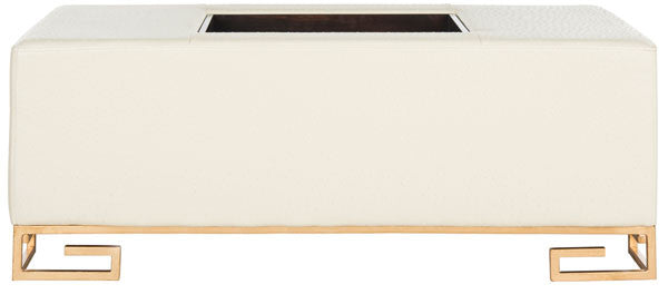 An exquisite pairing of form and function, this contemporary tray ottoman was inspired by the inimitable glamour and optimism of Old Hollywood. Ideal for entertaining, its decadent gold metal finish and cr¨me upholstery frame its removable tray.