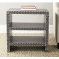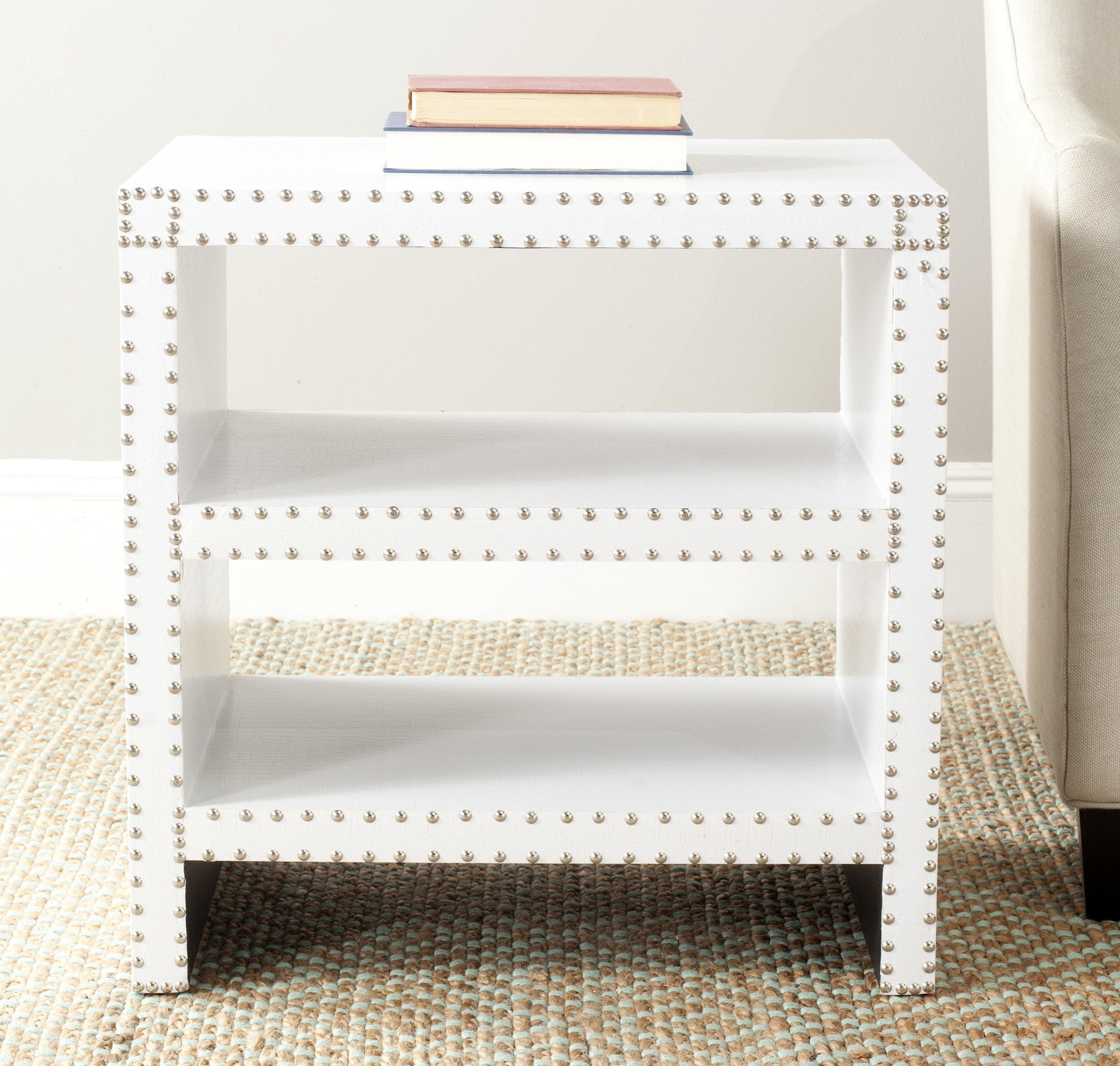 Three times the charm. The White, Green, Grey, Charcoal Lacey Side Table brings the functionality of three stylish shelves to the beauty of the sophisticated iron nail head detail on this traditional accent piece. (Pending)