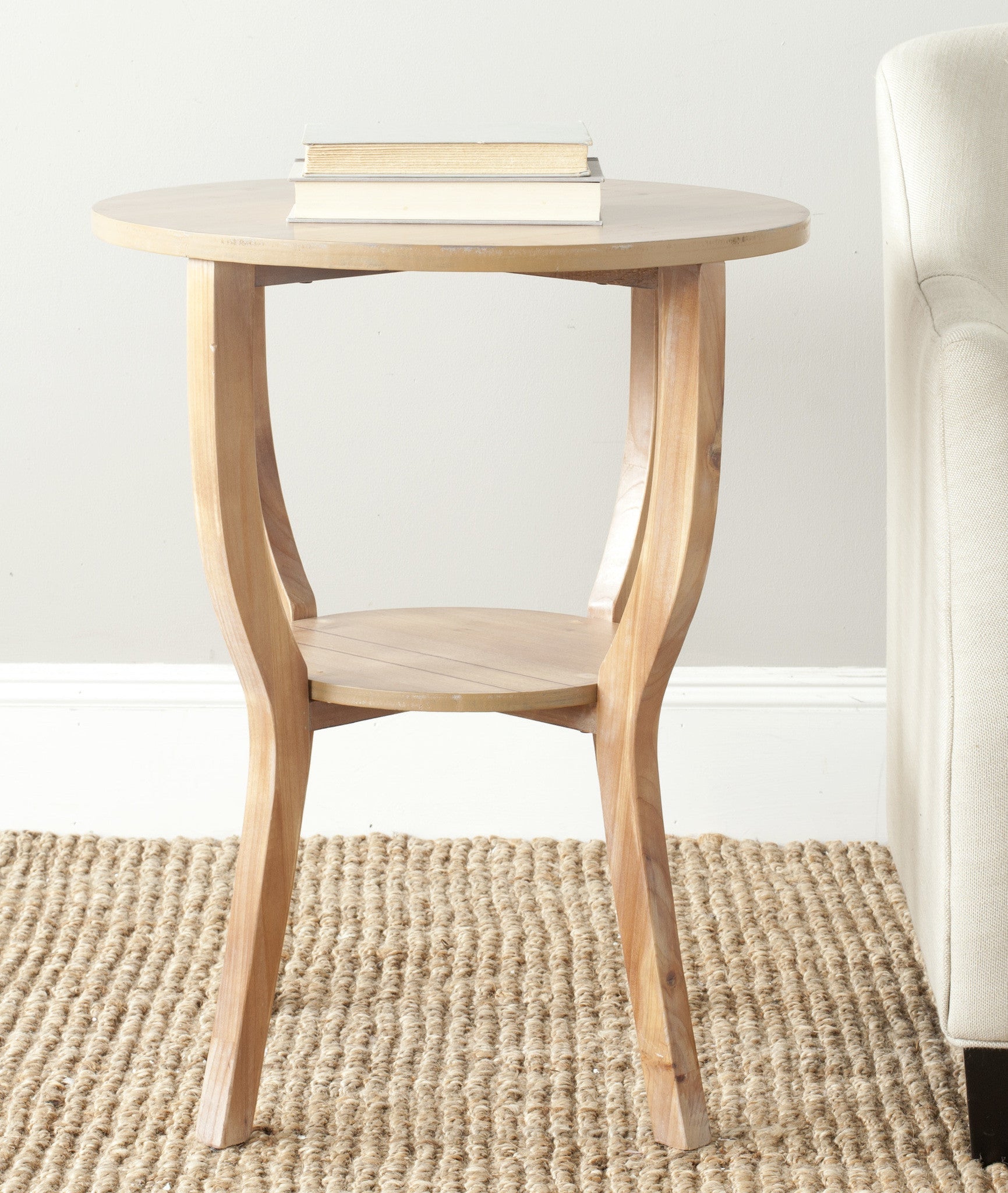 Brimming with country charm, the Rhodes accent table by Safavieh is pretty and practical beside a sofa or comfy chair. Crafted of elm wood with anash grey finish, the round top is paired with hour glass legs and useful storage shelf.