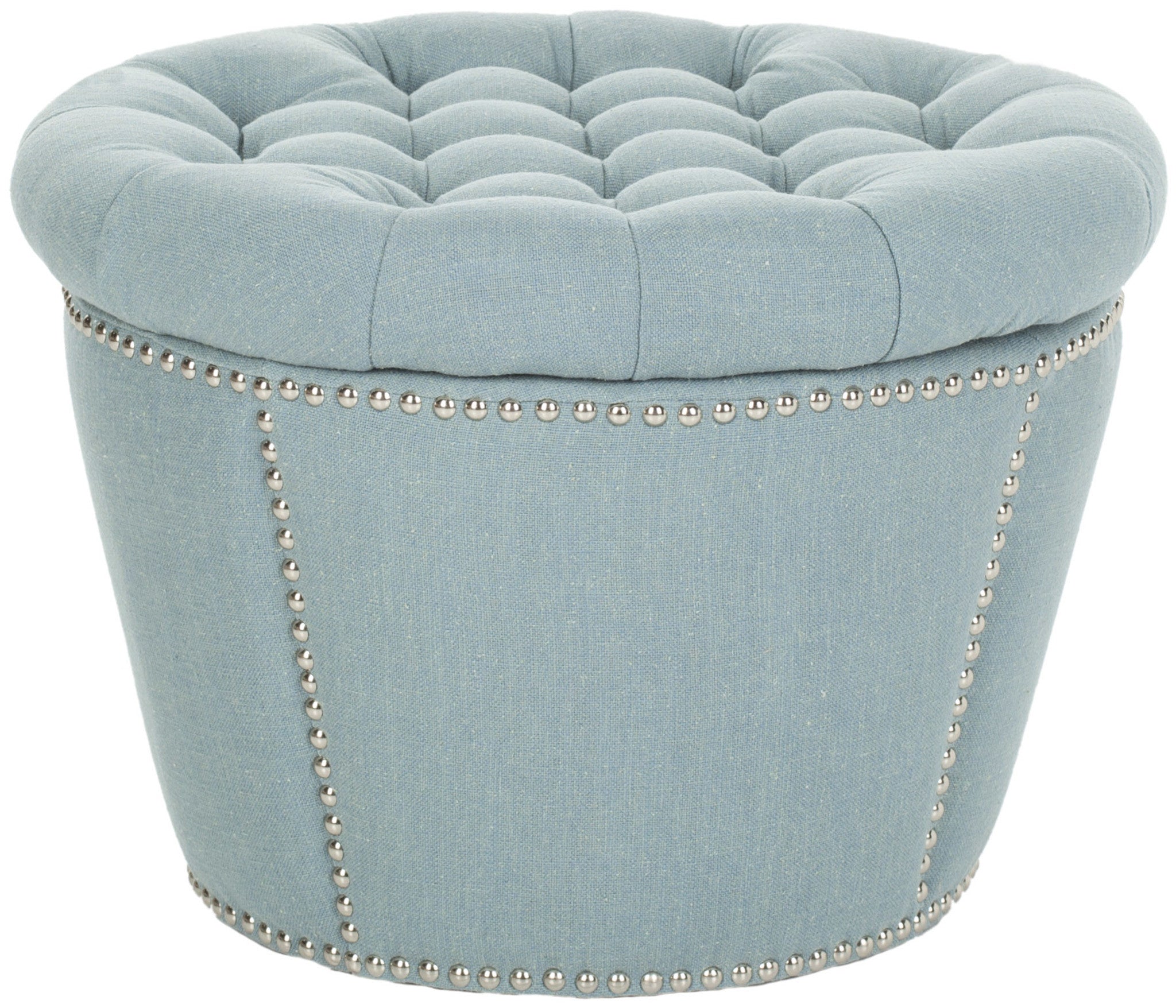Organic in color and fabric, the curvy Vanessa Ottoman is a pretty and practical addition to any space. Taupe linen is used on its base and luxuriously button-tufted lid, which lifts to reveal hidden storage space inside. Fashion-right nickel nail head detailing adds a designer touch.