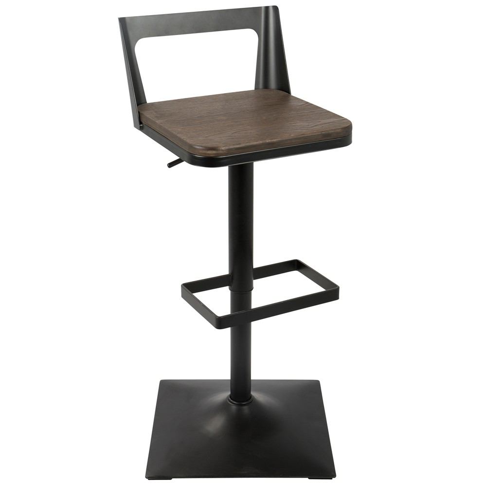 The sleek, angular construction of the Samurai Barstool is sure to make a bold statement in any living space. Lines of the rectangular-bordered backrest are echoed in the same shape of the footrest, while the combination of the espresso colored wood and black metal contribute to an eye-catching piece.