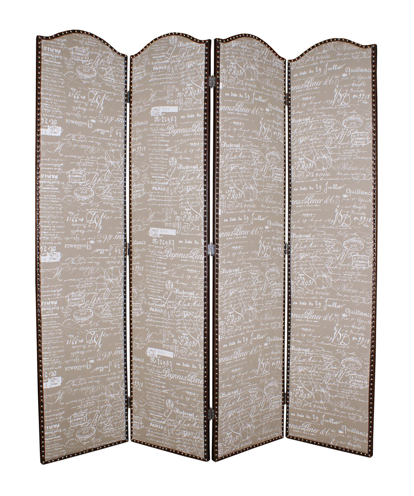 Add a natural, romantic look in a heartbeat with the GALORE Room Divider. Perfect for defining your space, this four-panel, double sided screen is crafted of sturdy fir with a textured burlap front decorated in a tufted ash fabric with letter design.