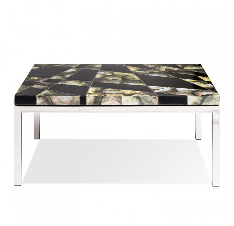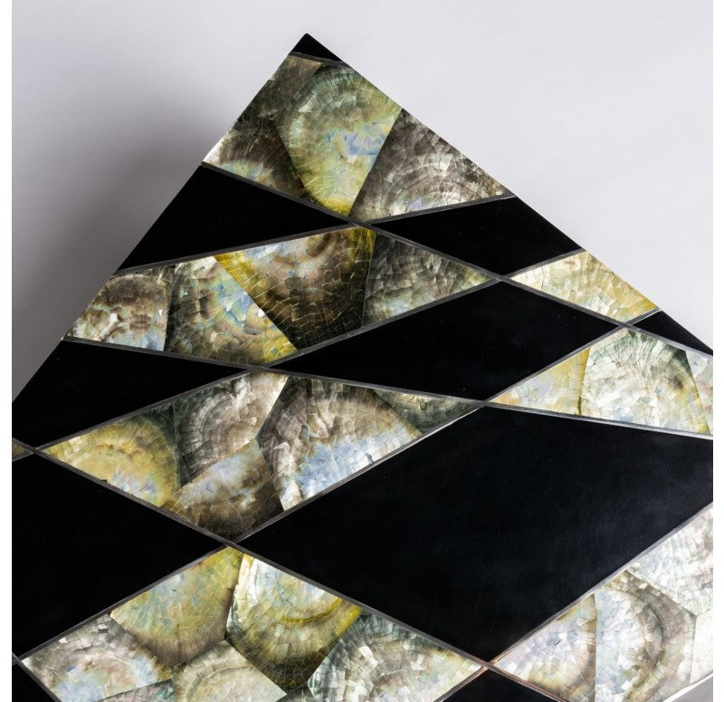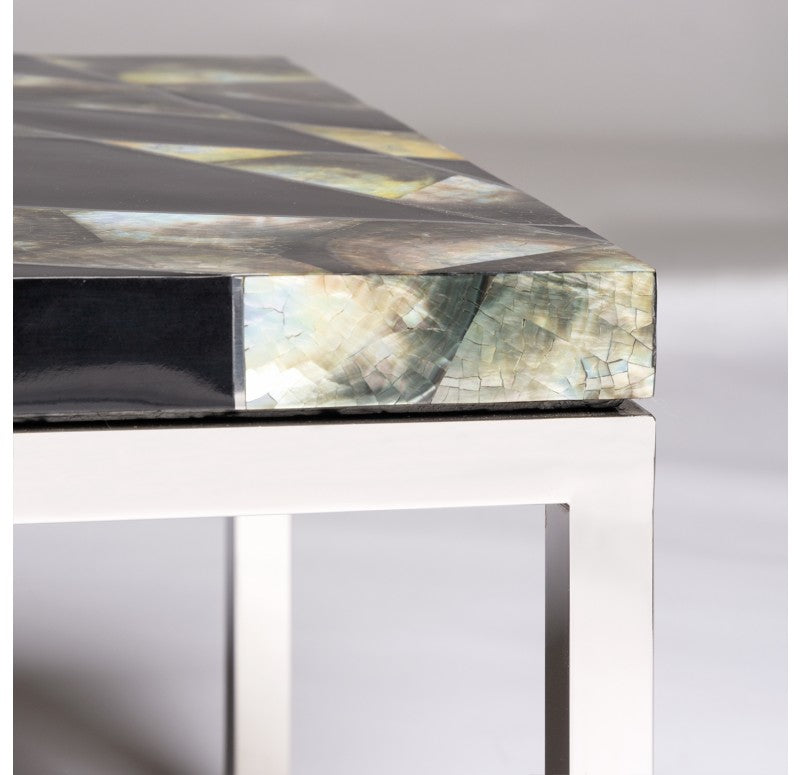 Handmade of resin, stainless steel and upcycled black lip shells (polished stainless steel base). Clean with a non-abrasive cloth. Indoor only. Truck shipping. Weight: 21.2 lbs.
