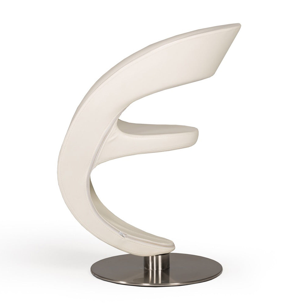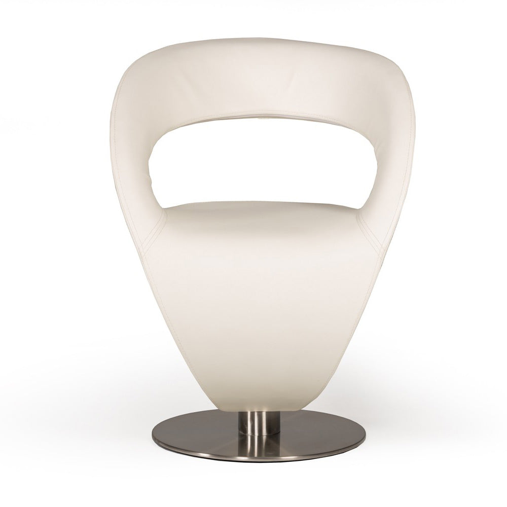 White leatherette upholstery complements the unconventional design and creates a sleek and ultra contemporary look. Accented with a 18” round stainless steel base. Available in white, grey, red and gold.