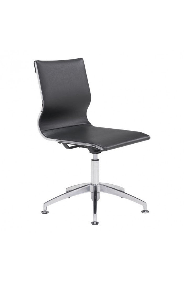 Glider conference chair features a slim yet comfortable profile with added lumbar support, soft leatherette upholstery accented with chrome star base. Color options are black white & taupe leatherette.