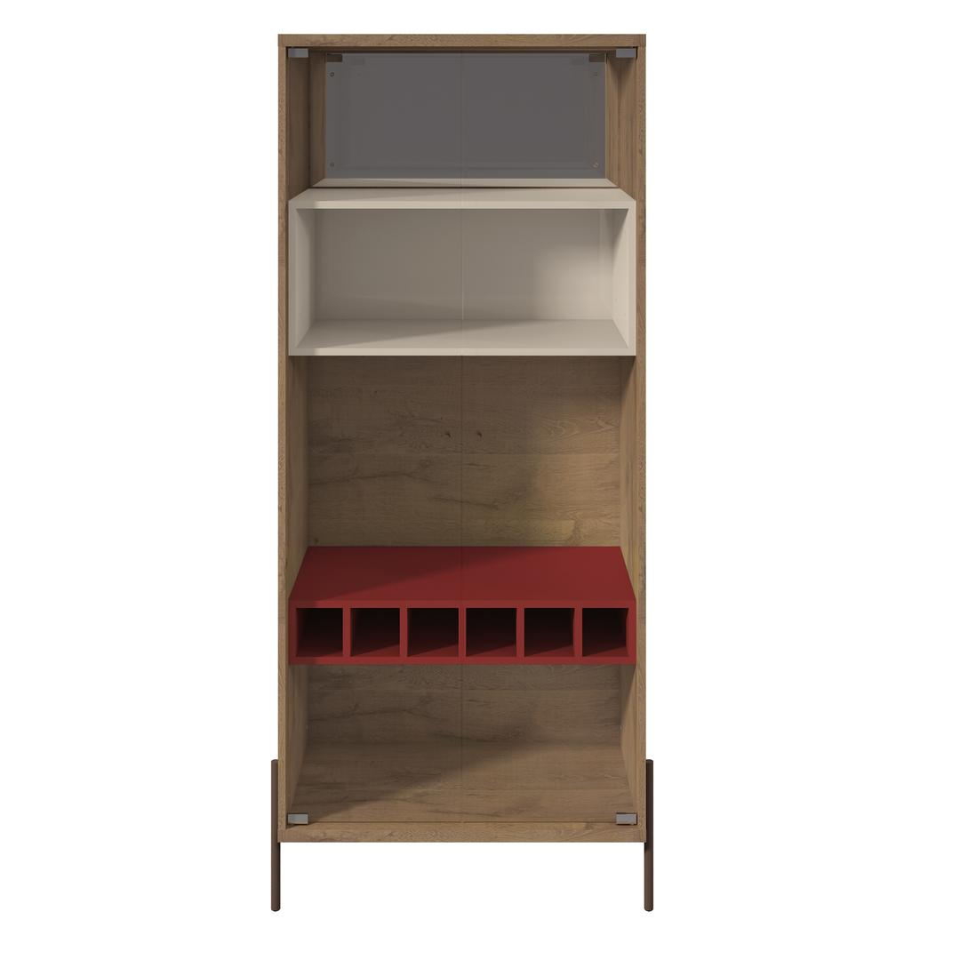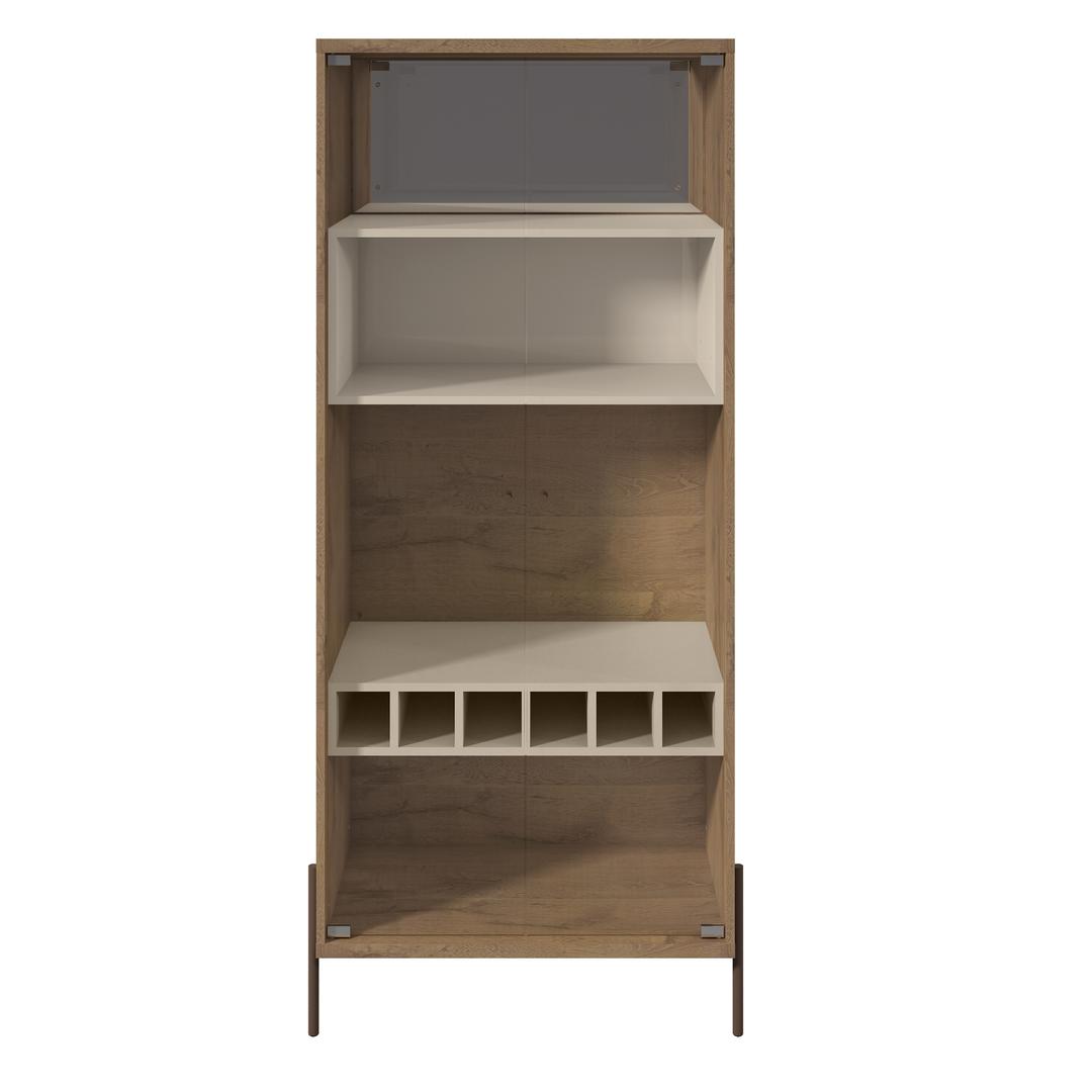 Built for the entertainer and thoughtfully designed for the wine lover, The Joy Wine Cabinet is the perfect dining room addition and serves as a functional showpiece that blends well with any decor. Featuring four open shelves that allow for ample storage and displaying wine glasses, platters, or dishes, while a bold smartly slotted shelf, holds six bottles of your best wine. An artful off-white cubed space, spotlights your favorite pieces, adding a touch of playfulness to this quality crafted cabinet. Two tempered glass doors equipped with sleek chrome handles, open at a convenient ninety degrees, and metal legs help keep this freestanding unit current.