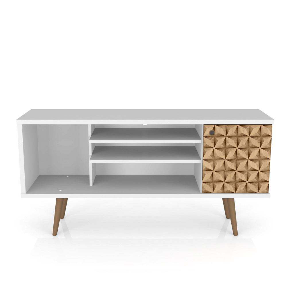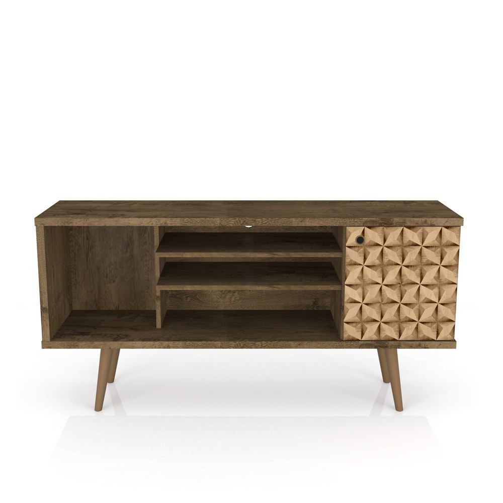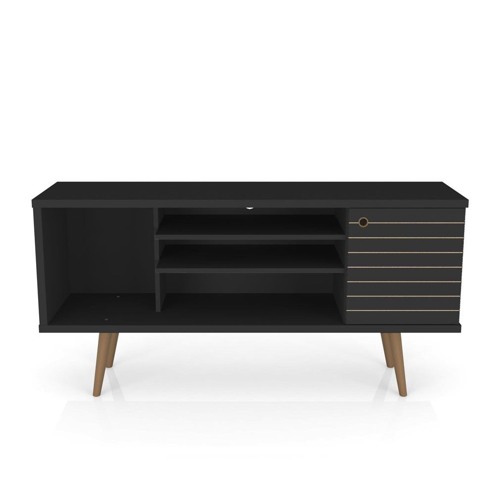 The Liberty 53.14 Mid-Century Modern TV Stand is the perfect blend of quality craftsmanship, brilliant design, and purposeful functionality. Featuring a large open compartment, one hidden cubby, and three center shelves to create the ultimate entertainment center perfect for stashing DVDs, board games, electronics, and media accessories. Free standing and easy to maneuver, this piece will mix well with any decor and its artful grooves will create a statement in any space.