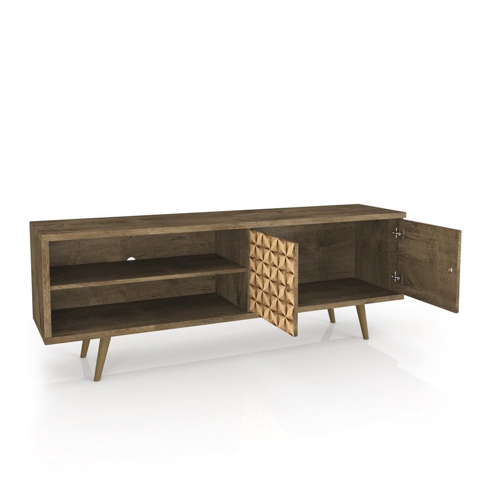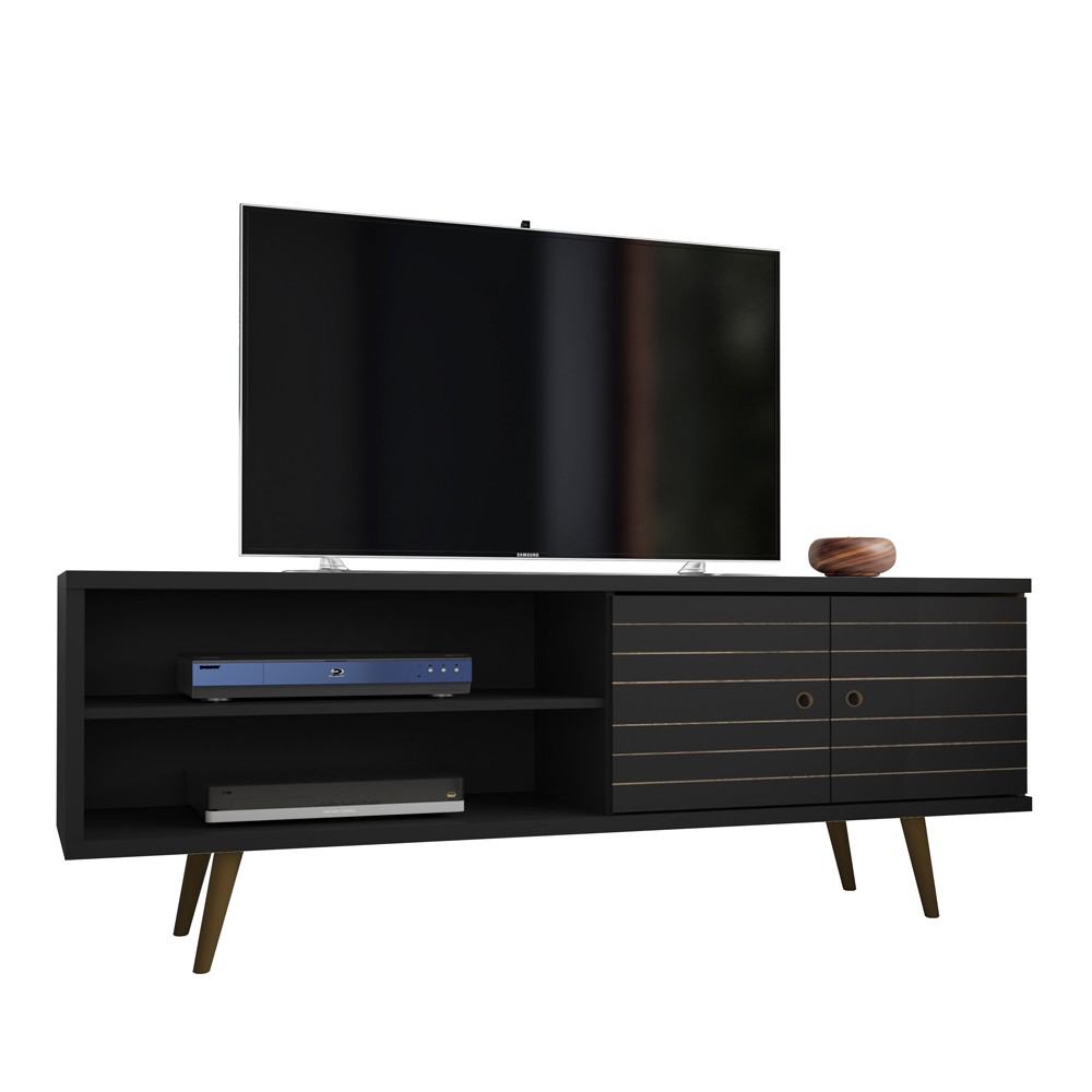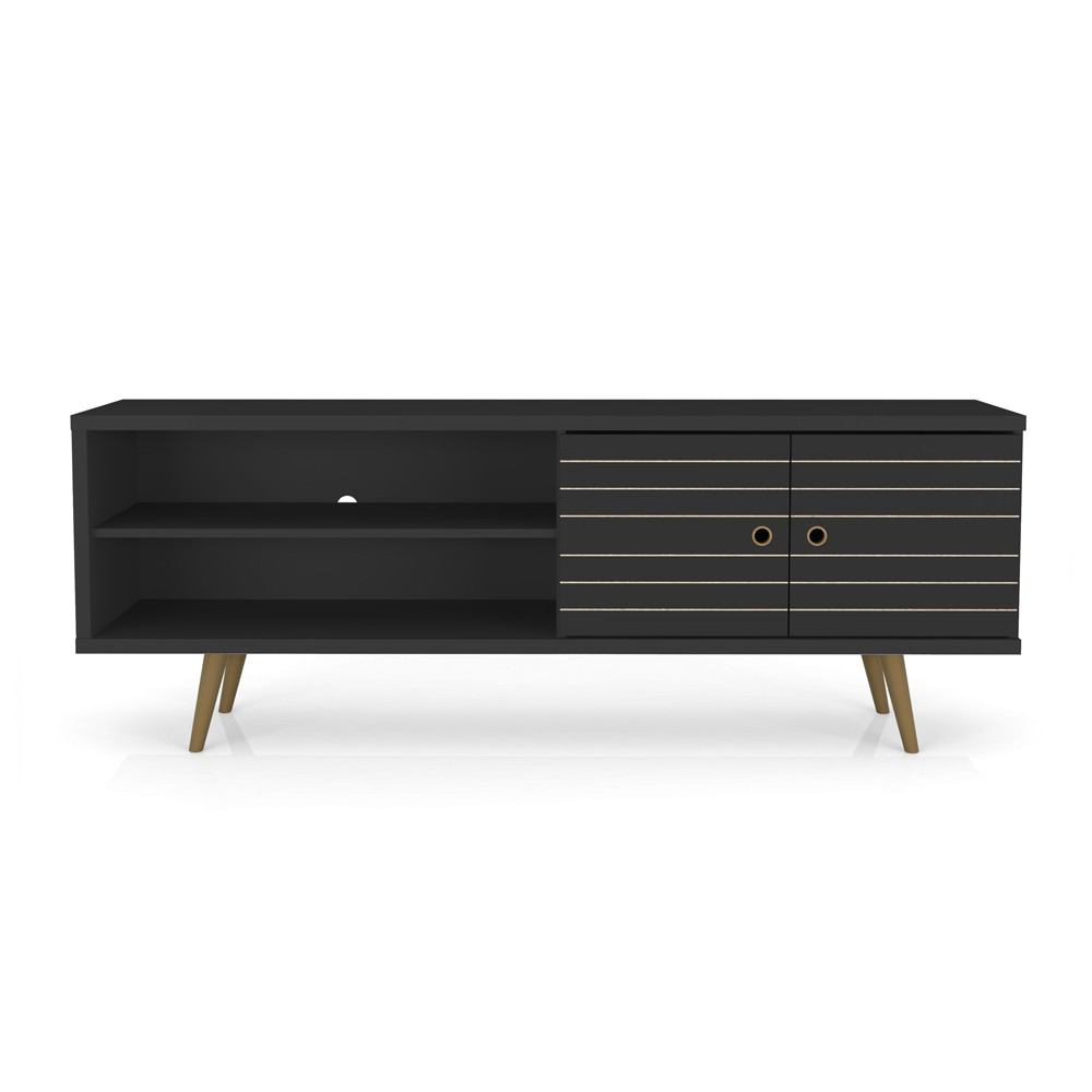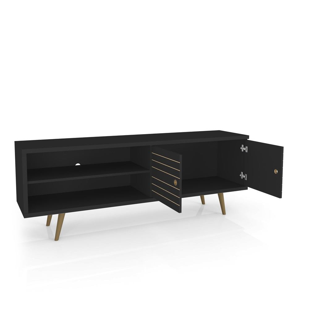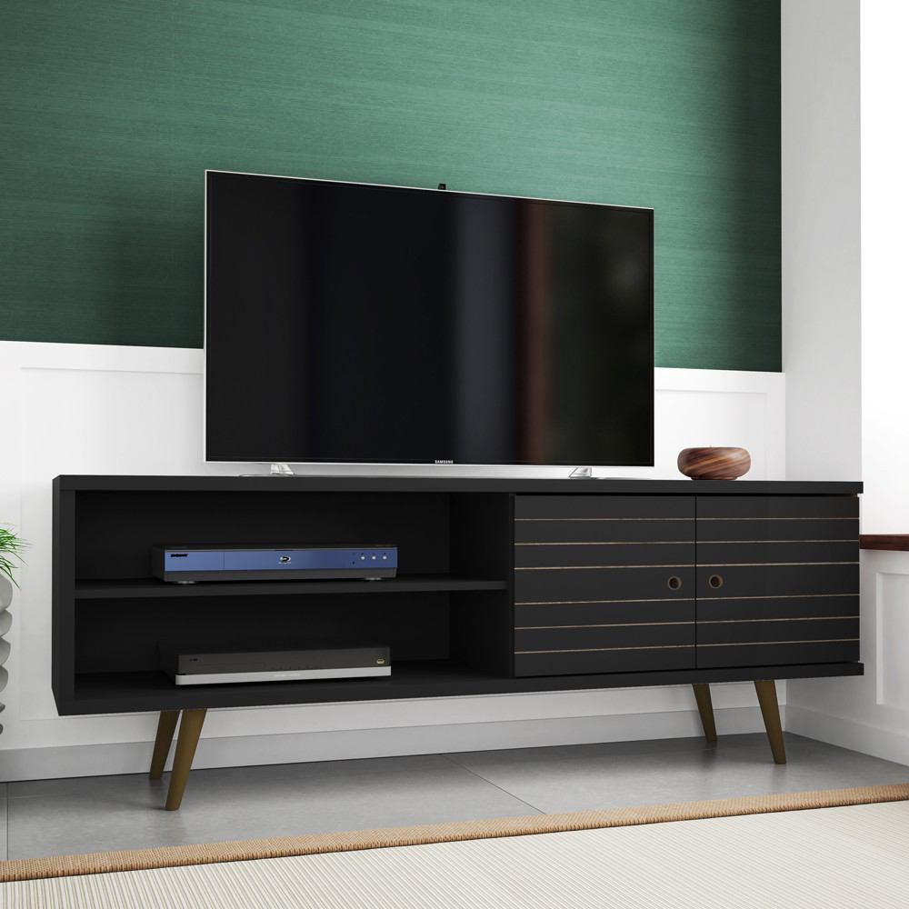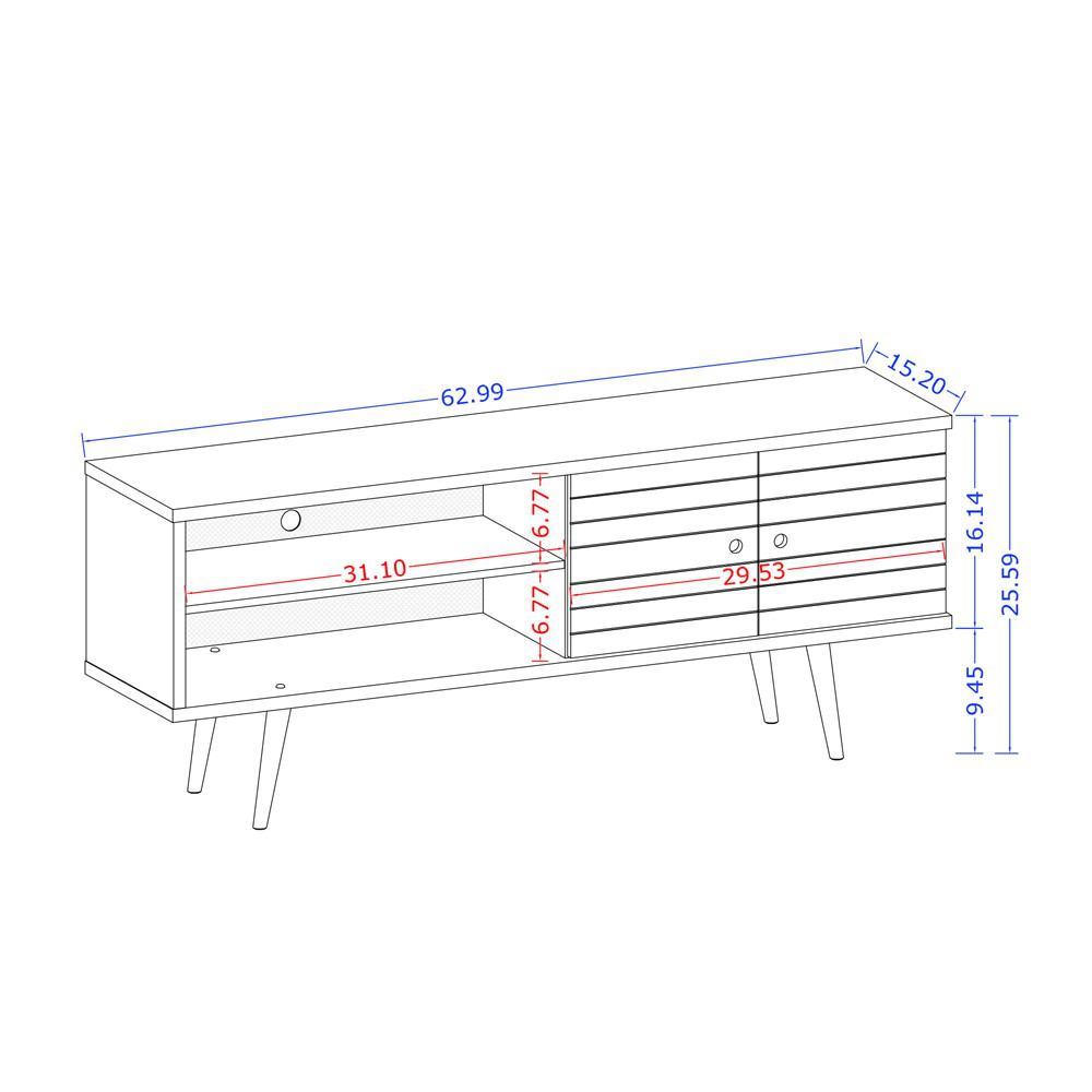 The Liberty 62.99 Mid-Century Modern TV Stand is a high quality, beautifully crafted, functional unit. Featuring two open shelves, and one large concealed compartment perfect for stashing DVDs, board games, electronics, and media accessories, this entertainment center is the ultimate gathering place and will create a statement in any space. Artful grooves mix well with any decor and splayed wooden legs add character and ease for moving.